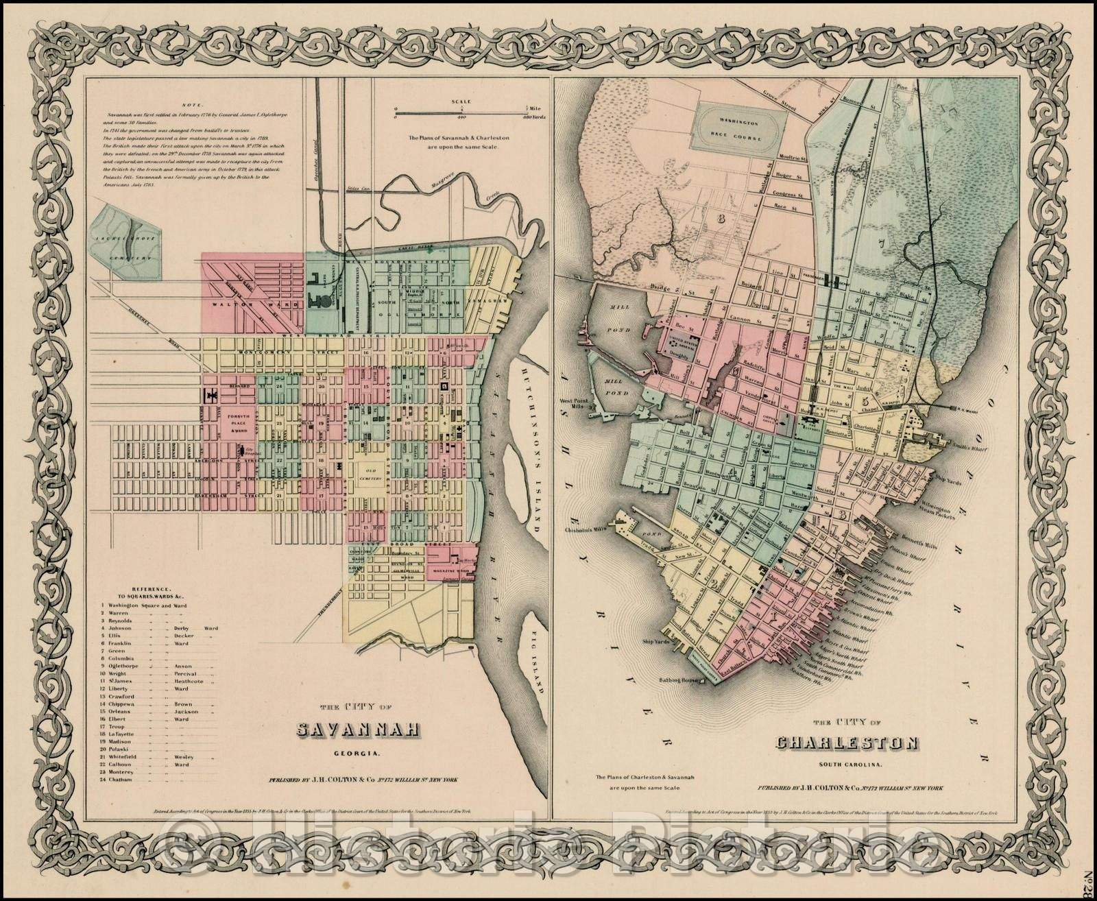 Historic Map - Colton's The City of Savannah Georgia [with] Colton's The City of Charleston South Carolina, 1855, Joseph Hutchins Colton - Vintage Wall Art