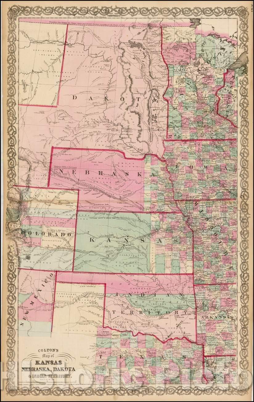 Historic Map - Colton's Map of Kansas, Nebraska, Dakota, Indian Territory, 1864, Joseph Hutchins Colton - Vintage Wall Art