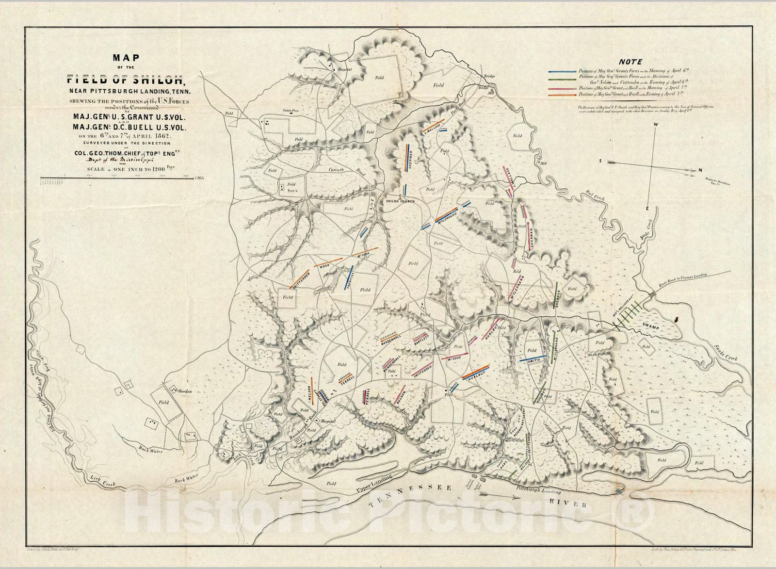 Map Of The Field Of Shiloh, Near Pittsburgh Landing, Tenn. Shewing The Position of the U.S. Forces under the Command Of Maj. Genl. U.S. Grant U.S. Vol. And Maj. Genl. D.C. Buell U.S. Vol. On The 6th And 7th of April 1862. Surveyed Under The Direction Of Col. Geo Thom. Chief of Topl. Engrs. Drawn by Otto H. Matz, Asst. Topl. Engr. Lith. by Chas. Robyn & Co. cor. Chestnut and 3d St, St. Louis Mo. | Map Of The Field Of Shiloh, Near Pittsburgh Landing, Tenn. Shewing The Position of the U.S. Forces under the Command Of Maj. Genl. U.S. Grant U.S. Vol. And Maj. Genl. D.C. Buell U.S. Vol. On The 6th And 7th of April 1862. Surveyed Under The Direction Of Col. Geo Thom. Chief of Topl. Engrs. Drawn by Otto H. Matz, Asst. Topl. Engr. Lith. by Chas. Robyn & Co. cor. Chestnut and 3d St, St. Louis Mo. |
