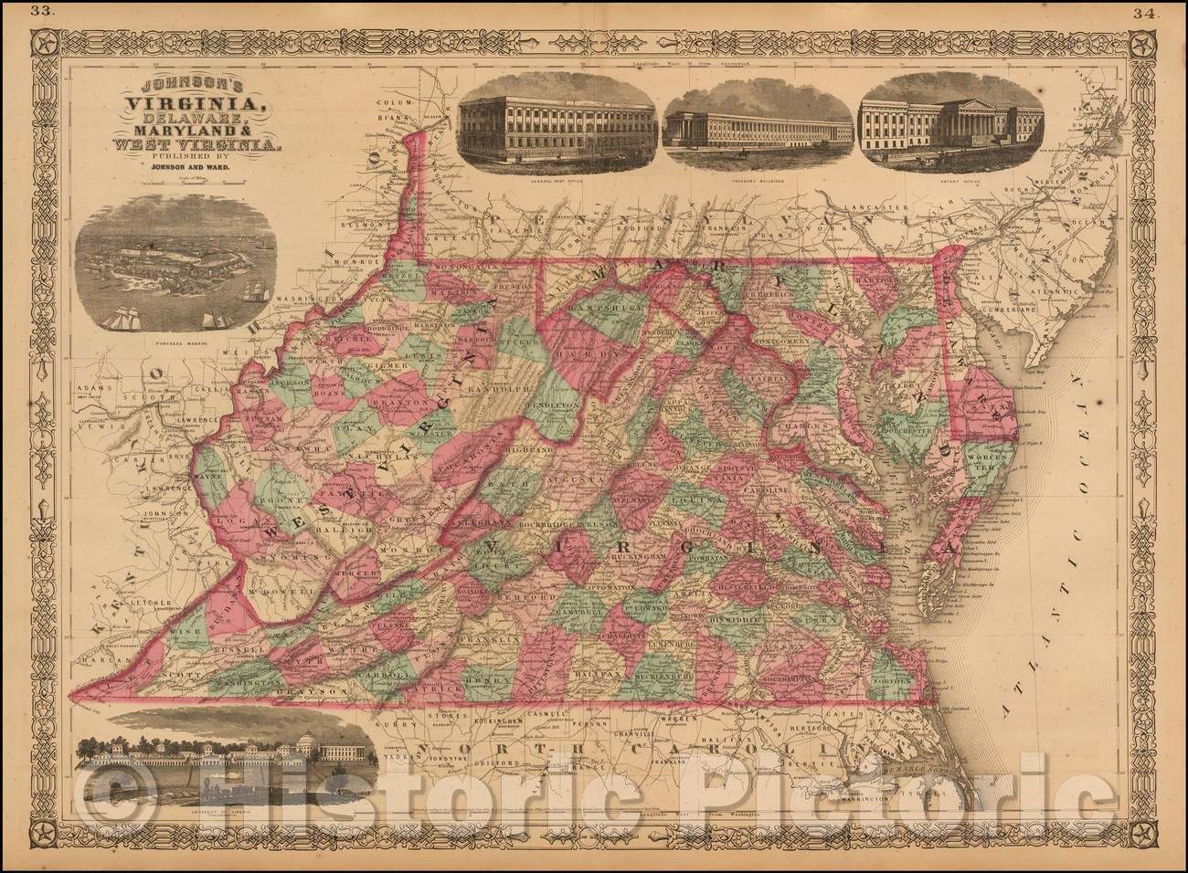 • .Historic Map - Johnson's Virginia, Delaware, Maryland & West Virginia, 1865, Benjamin Ward - Vintage Wall Art