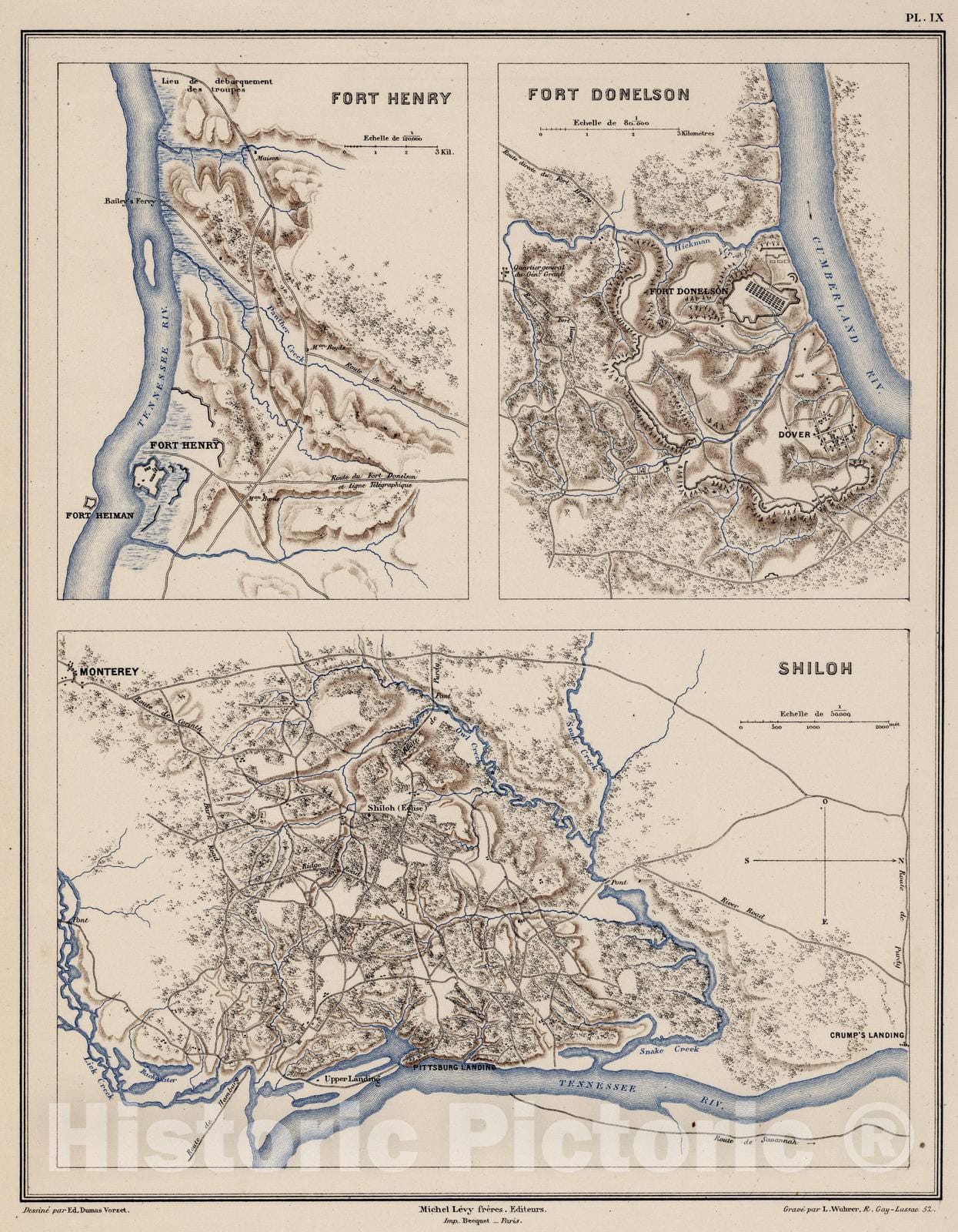 Historic Map : Military Atlas - 1874 Planche IX. Fort Henry. Fort Donelson. Shiloh. - Vintage Wall Art