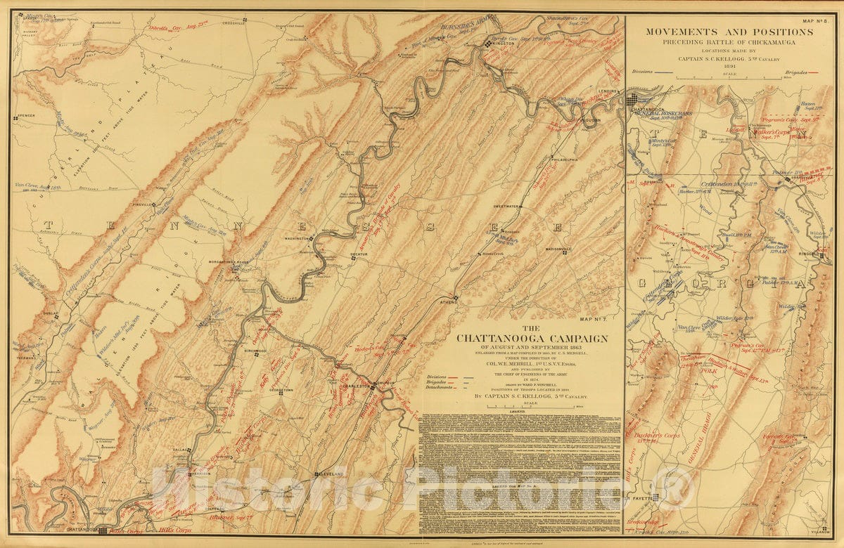 • .Historic Map : Military Atlas - 1891 Chattanooga, Chickamauga campaigns. - Vintage Wall Art