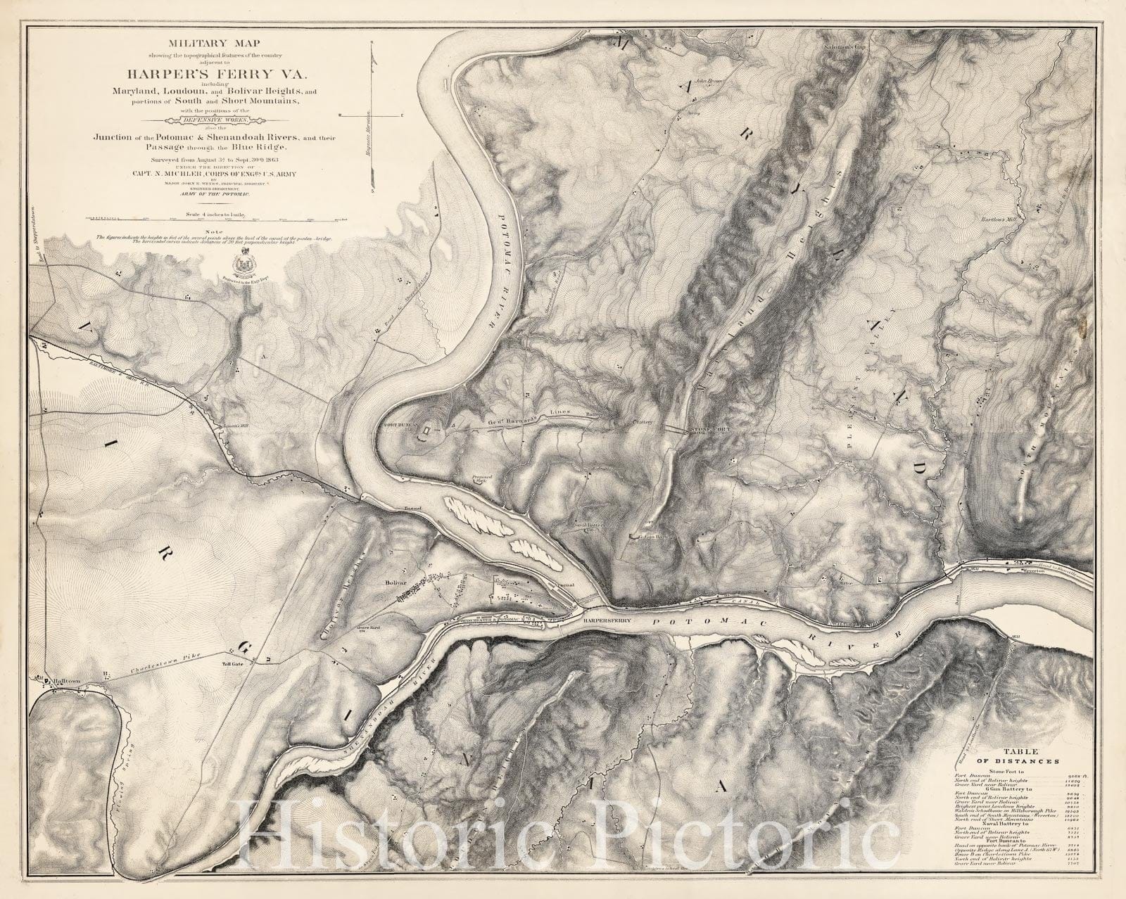 Military Map showing the topographical features of the country adjacent to Harper's Ferry Va. including Maryland, Loudoun, and Bolivar Heights, and portions of South and Short Mountains, with the positions of the Defensive Works, also the Junction of the Potomac & Shenandoah Rivers, and their passage through the Blue Ridge. Surveyed from August 3d to Sept. 30th 1863 Under The Direction Of Capt. N. Michler, Corps of Engrs U.S. Army By Major John E. Weyss, Principal Assistant, Engineer Department, Army Of The Potomac ... | Military Map showing the topographical features of the country adjacent to Harper's Ferry Va. including Maryland, Loudoun, and Bolivar Heights, and portions of South and Short Mountains, with the positions of the Defensive Works, also the Junction of the Potomac & Shenandoah Rivers, and their passage through the Blue Ridge. Surveyed from August 3d to Sept. 30th 1863 Under The Direction Of Capt. N. Michler, Corps of Engrs U.S. Army By Major John E. Weyss, Principal Assistant, Engineer Department, Army Of The Potomac ... |