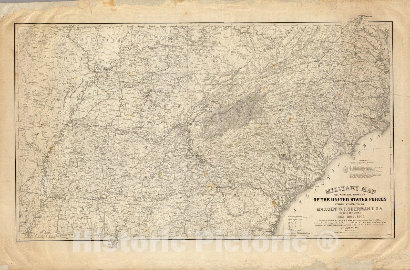 Military map showing the marches of the United States Forces under the command of Maj. Genl. W.T. Sherman, U.S.A. During the years 1863, 1864, 1865 ... Drawn by Capt. William Kossak ... and John B. Muller, draughtsman. St. Louis, Mo., 1865. Printed by Joseph F. Gedney. Engraved at Head Qrs., Corps of Engineers, U.S.A. by H.C. Evans & F. Courtenay. | Military map showing the marches of the United States Forces under the command of Maj. Genl. W.T. Sherman, U.S.A. During the years 1863, 1864, 1865 ... Drawn by Capt. William Kossak ... and John B. Muller, draughtsman. St. Louis, Mo., 1865. Printed by Joseph F. Gedney. Engraved at Head Qrs., Corps of Engineers, U.S.A. by H.C. Evans & F. Courtenay. |