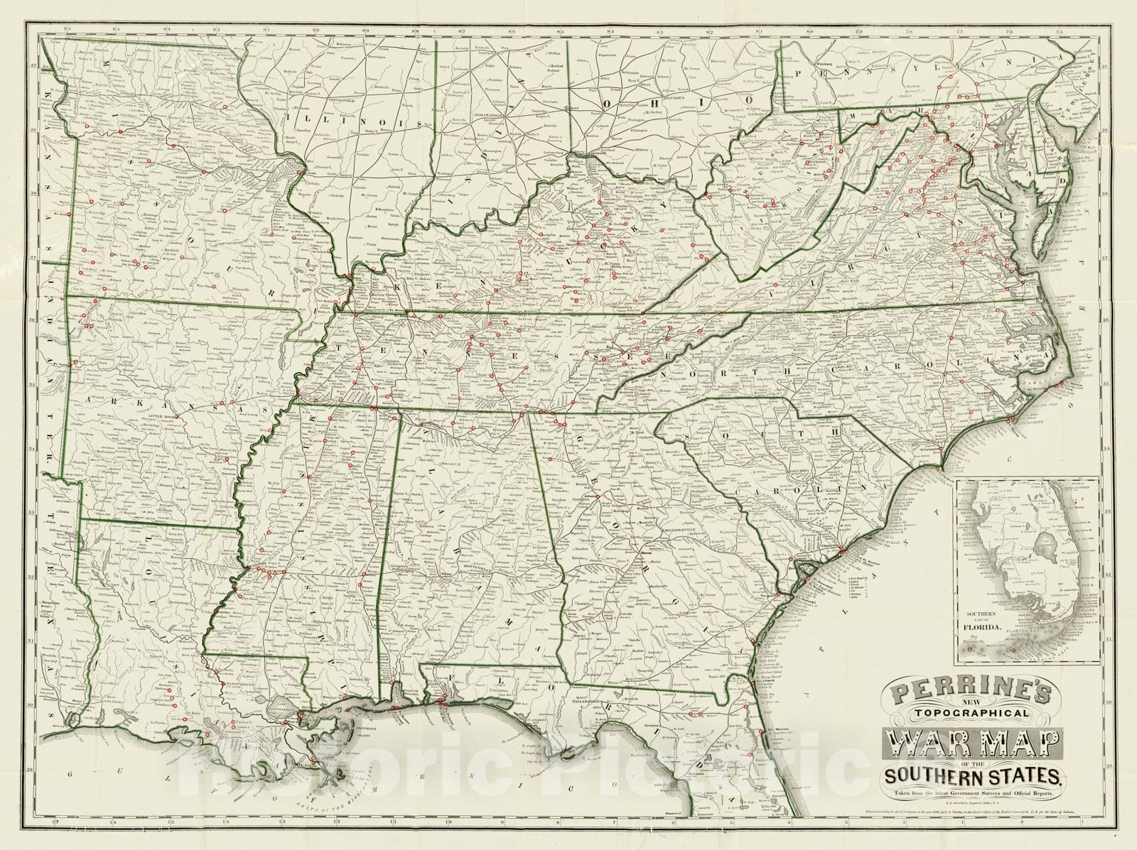 Perrine's New Topographical War Map Of The Southern States. Taken from the latest Government Surveys and Official Reports. E.R. Jewett & Co., Engravers, Buffalo, N.Y. Entered ... 1863, by C.O. Perrine ... Indiana. (inset) Southern Part Of Florida. | Perrine's New Topographical War Map Of The Southern States. Taken from the latest Government Surveys and Official Reports. E.R. Jewett & Co., Engravers, Buffalo, N.Y. Entered ... 1863, by C.O. Perrine ... Indiana. (inset) Southern Part Of Florida. | See note field above.