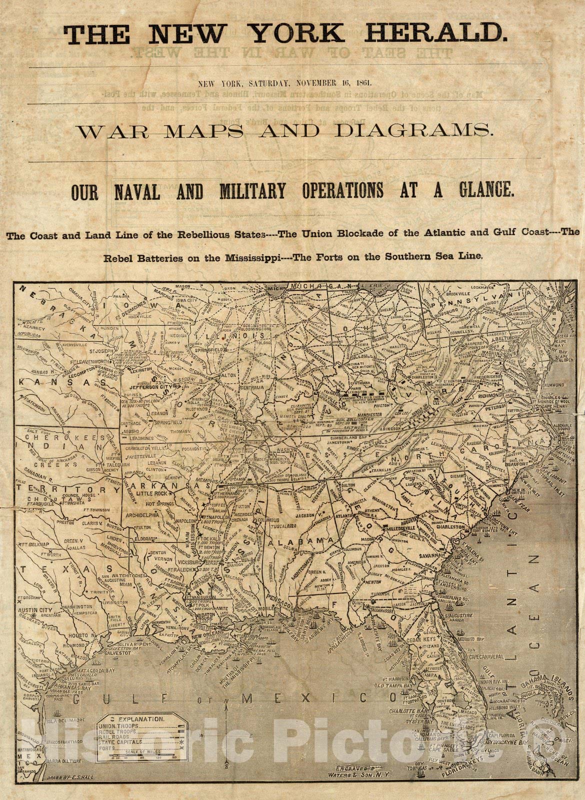 War Maps And Diagrams. Our Naval And Military Operations At A Glance. The Coast and Land Line of the Rebellious States ... The Union Blockade of the Atlantic and Gulf Coast ... The Rebel Batteries on the Mississippi ... The Forts on the Southern Sea Line. The New York Herald. New York. Saturday, November 16, 1861. (with) 17 additional maps. | War Maps And Diagrams. Our Naval And Military Operations At A Glance. The Coast and Land Line of the Rebellious States ... The Union Blockade of the Atlantic and Gulf Coast ... The Rebel Batteries on the Mississippi ... The Forts on the Southern Sea Line. The New York Herald. New York. Saturday, November 16, 1861. (with) 17 additional maps. | Titles of additional maps: Important Operations In Kentucky And Tennessee. The Seat of War In Kentucky. The Fight At Santa Rosa Island. Map Of The Rebel Capital. The Affair At Chicamacomico. Very Curious Rebel Semi-Official Pictorial View Of The Battle Of Bull Run. Map Of New Orleans and Surrounding Country. The Lower Potomac. The Seat Of War In The West. Our Brilliant Naval Victory. The Seat Of War In Missouri. The Upper Potomac. The Scene Of Action. Fort Walker. Seat Of War Around Paducah And Columbus, Georgia. The Seat Of War In Western Virginia. The Great Naval Expedition. On one large sheet, uncolored, printed on both sides and folded to a size of 53x38. Much more complete than Stephenson who catalogs only the top folded sheet and gives much smaller dimensions.