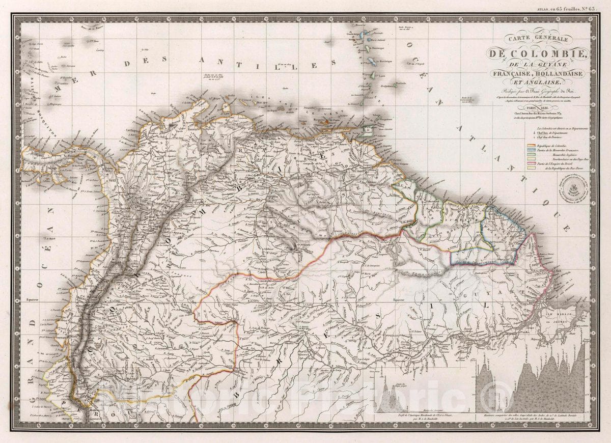 Colombia, Guiana, South America Carte generale de Colombie, de la Guyane Francaise, Hollandaise et Anglaise, 1826 Atlas , Vintage Wall Art