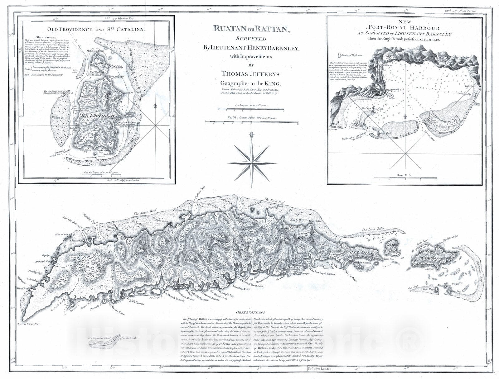 • .Historic Map : Colombia; Honduras, Providence Island (Colombia) 1775 Ruatan or Rattan. , Vintage Wall Art