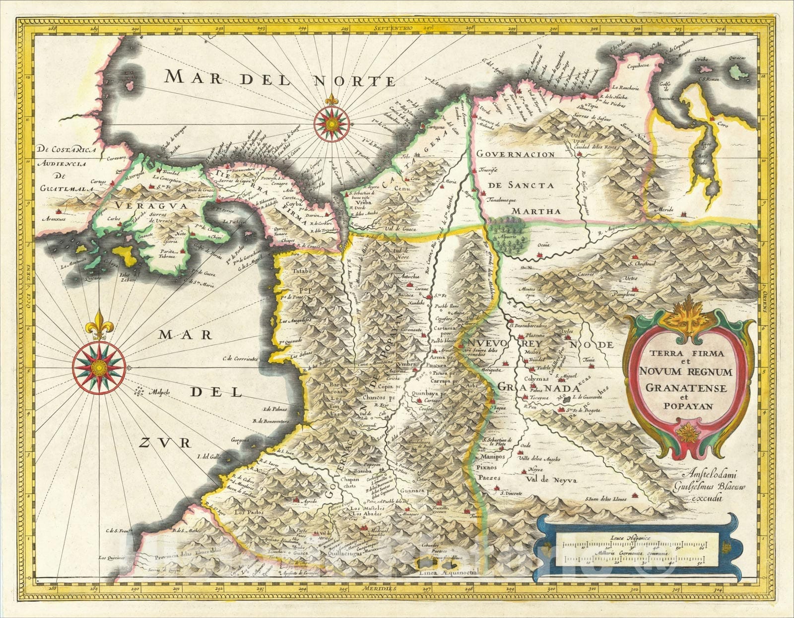 Historic Map : (Colombia) Terra Firma et Novum Regnum Granatense et Popayan, 1635, Willem Janszoon Blaeu, Vintage Wall Art