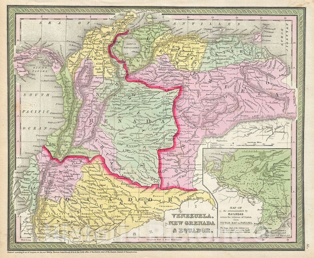 This is a fine example of Thomas Cowperthwait and S. A. Mitchell's 1854 map of Venezuela, Colombia (New Grenada) and Ecuador. The whole is engraved and colored in Mitchell's distinctive style with green border work and vivid pastels. Political and topographical features are noted and color coded with elevation rendered by hachure. The railroad across the Isthmus of Darien (Panama) is shown via an inset in the lower right quadrant.