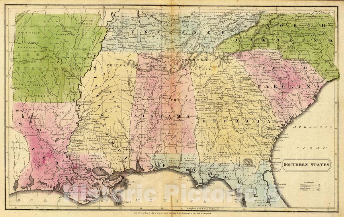 Historic Map : 1832 School Atlas - Southern States. Entered April 23d, 1832 by F.J. Huntington Connecticut. - Vintage Wall Art