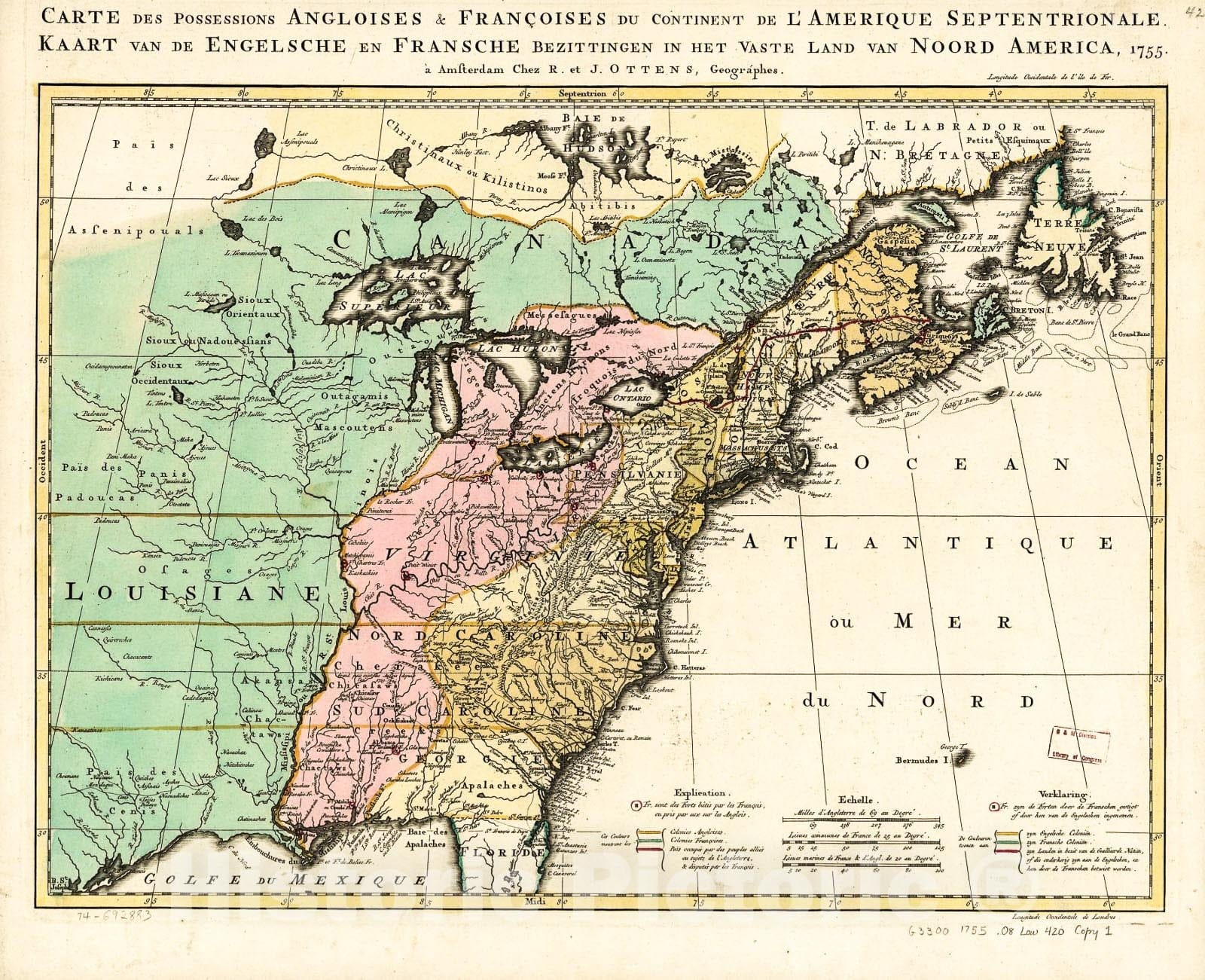 Historic 1755 Map - Carte des Possessions angloises & françoises du Continent de l'Amérique septentrionale.
