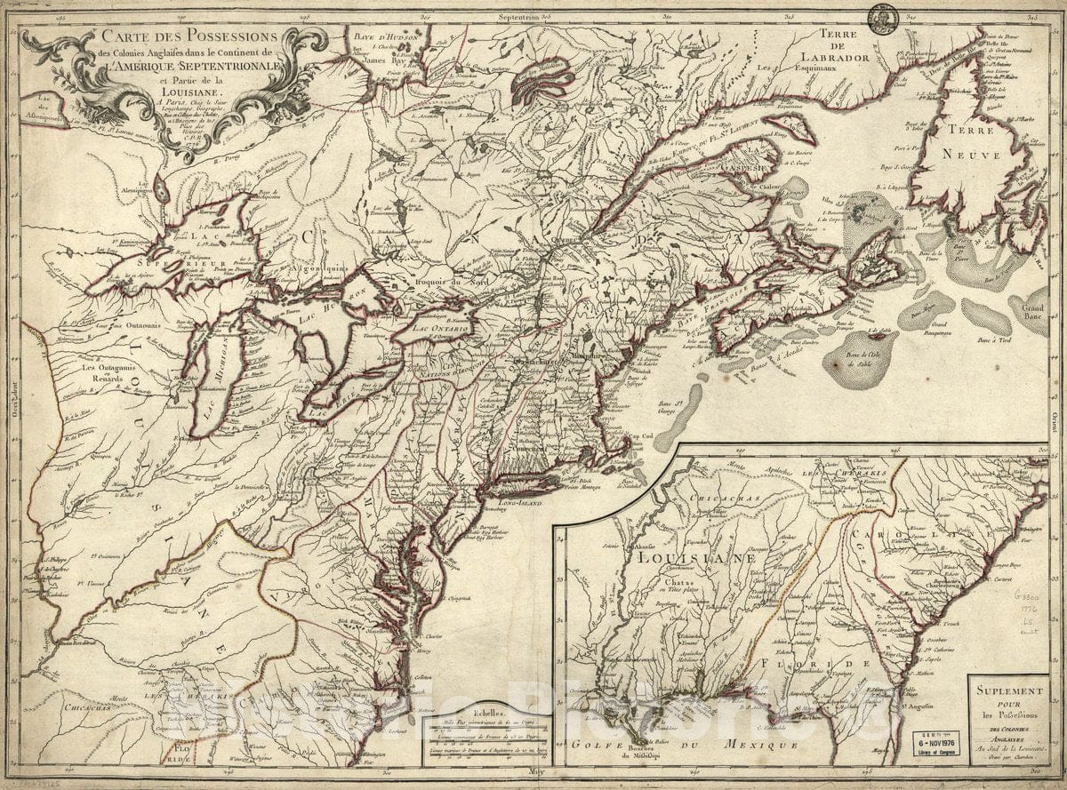 Historic 1776 Map - Carte des Possessions des Colonies Anglaises Dans le Continent de l'Amérique Septentrionale et Partie de la Louisiane.