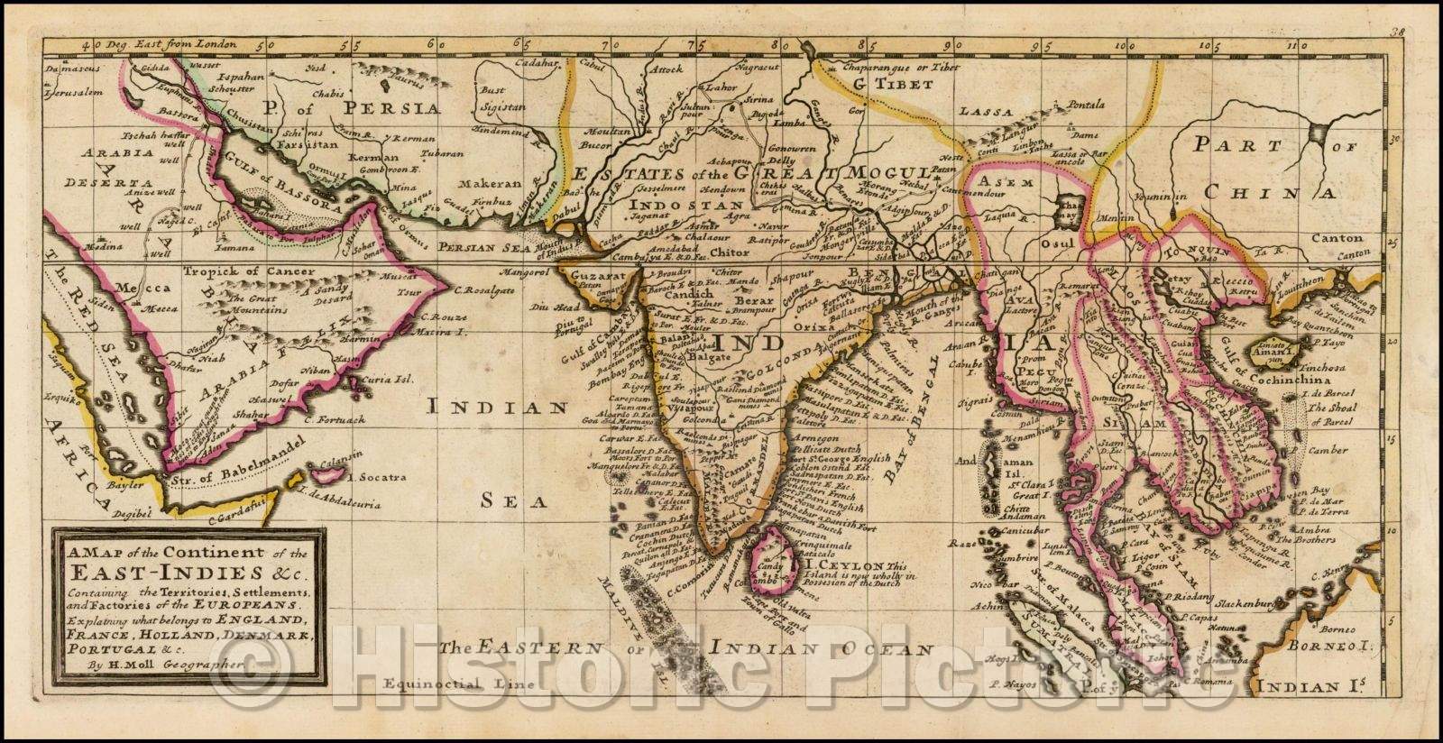 Historic Map - Continent of the East-Indies &c, Containing the Territories, Settlements, and Factories of the Europeans. Explaining what belongs to Eng, 1729 - Vintage Wall Art