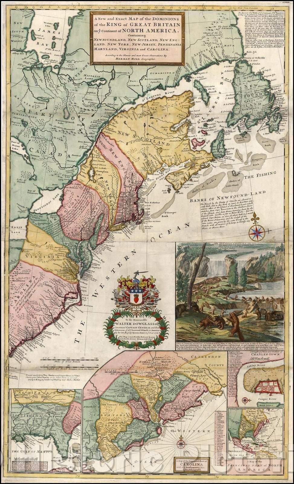 • .Historic Map - A New and Exact Map of the Dominions of the King of Great Britain on ye Continent of North America, 1715, Herman Moll - Vintage Wall Art