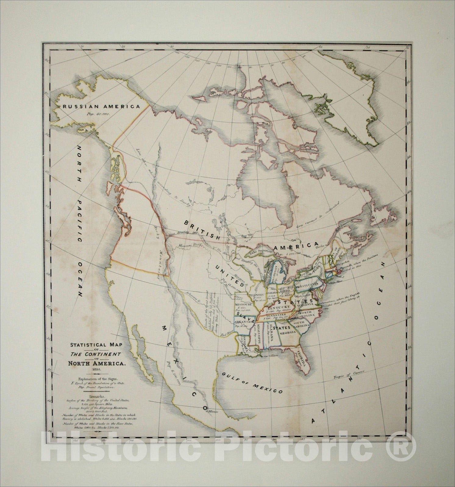 • .Historic Map : Statistical Map of The Continent of North America. 1835, 1835, Alexis De Tocqueville, Vintage Wall Art