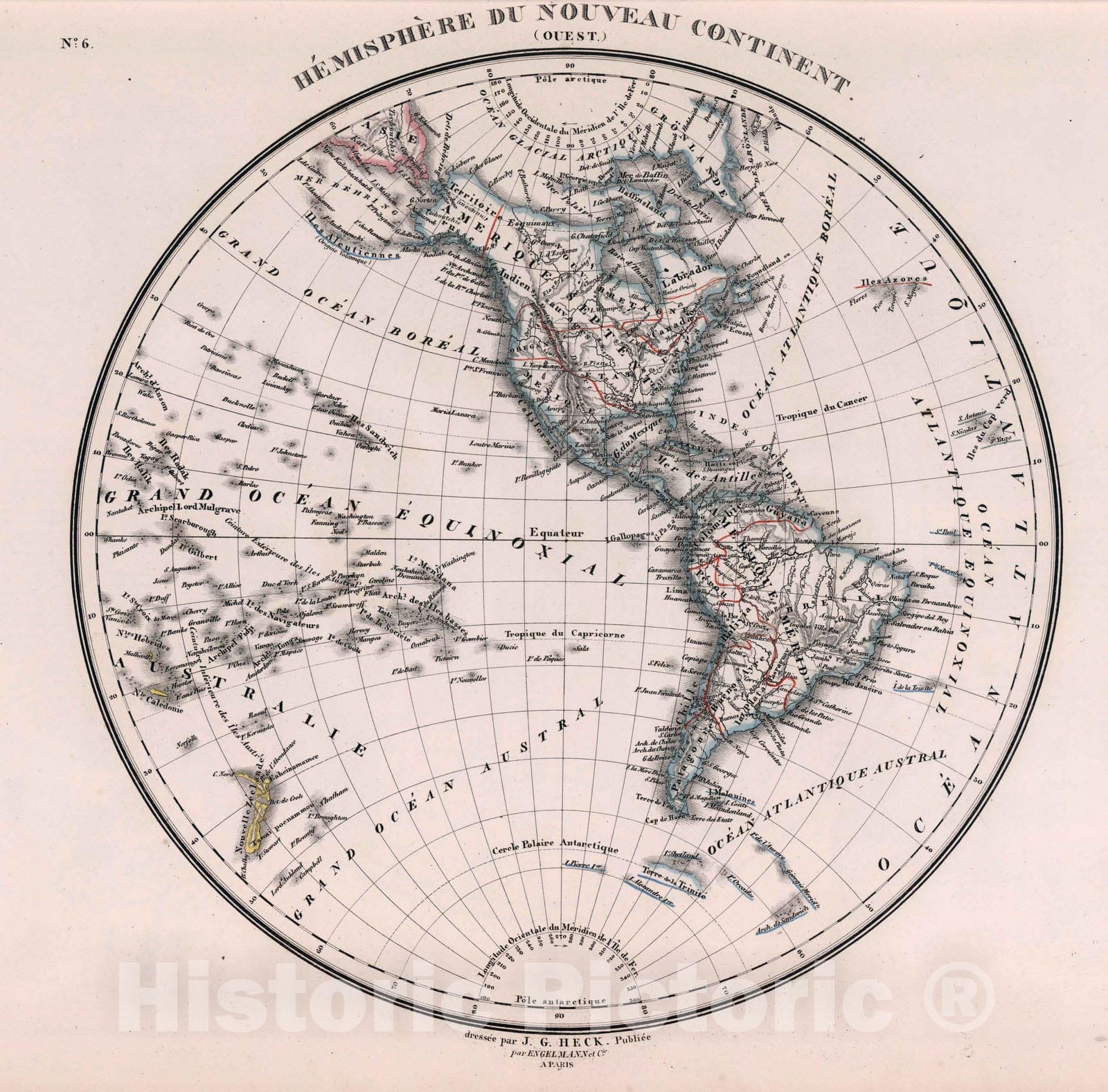 6. Hemisphere du Nouveau Continent (Ouest). | Atlas geographique, astronomique et historique, servant a l'intelligence de l'histoire ancienne, du moyen age et moderne et a la lecture des voyages les plus recens. Dresse d'apres les meilleurs materiaux tant francais qu'etrangers conformement aus progres de la science, par J.G. Heck. - Paris, Engelmann & Compagnie, S.F. | Johann Georg Heck was a German bookseller and publisher, lithographer, cartographer, geographer and author. He became known through his work the Illustrated atlas for Conversations lexicon, Iconographic Encyclopaedia of Sciences and Arts, one of the largest German view works of the 19th century (see our copy). This atlas Geographique.. is his only known atlas. In the atlas, his thematic maps are especially noteworthy. Relief shown with hachures. Outline color.