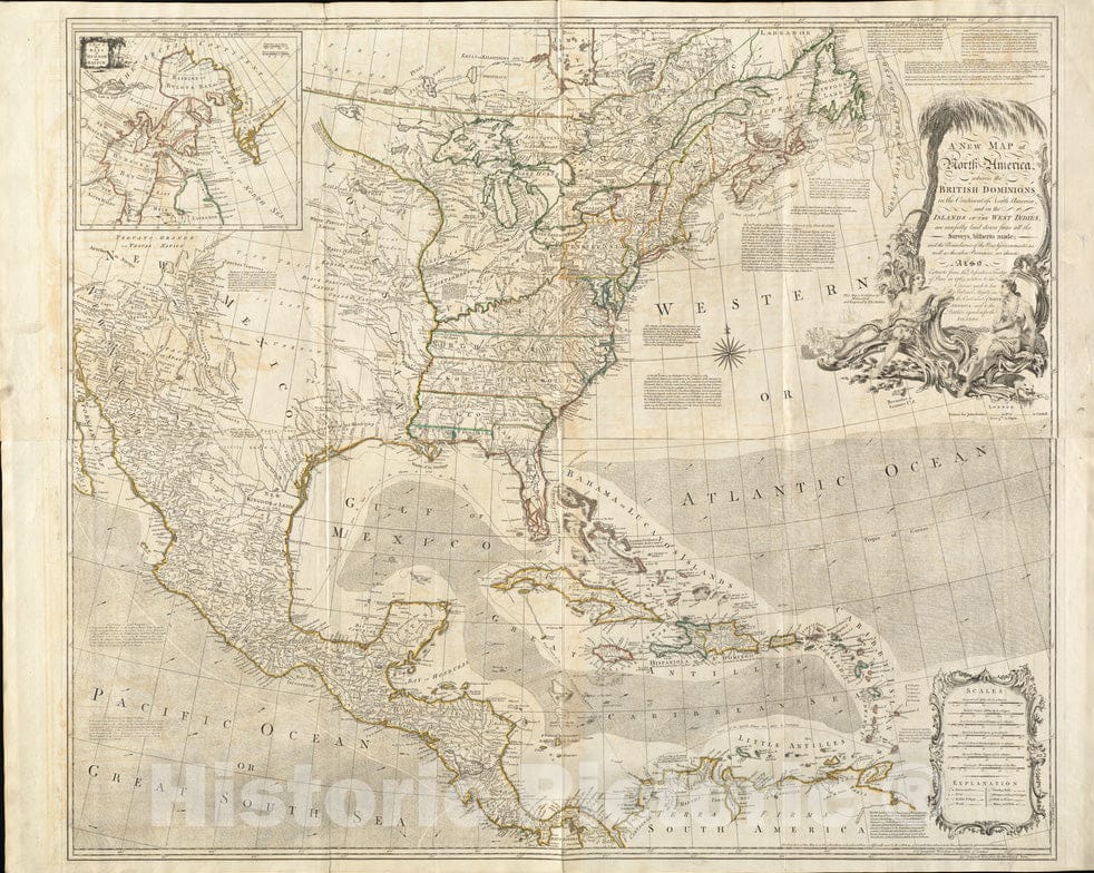 Historical Map, 1763 A New map of North America wherein The British Dominions in The Continent of North America : and on The Islands of The West Indies, Vintage Wall Art