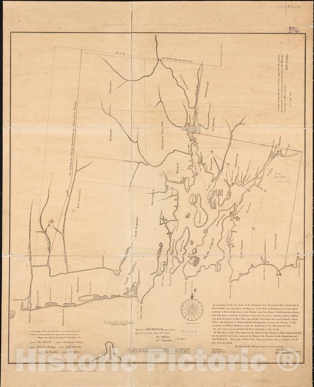 An exact plan of the sea coast of the continent from Paucatuck River eastwards to Point Judith and from thence northwards to the town of Providence and from thence southerly or the easterly shore round Bristol and from thence north easterly to assonet and from thence southerly to Seaconet Point and from thence easterly to Slocum's Harbour : and by the assistance of other plans and drafts is described the several islands ponds rivers and divisions of towns with the dividing line between the colonys of Connecticutt and Rhode Island as also the south line of the Massachusetts Bay