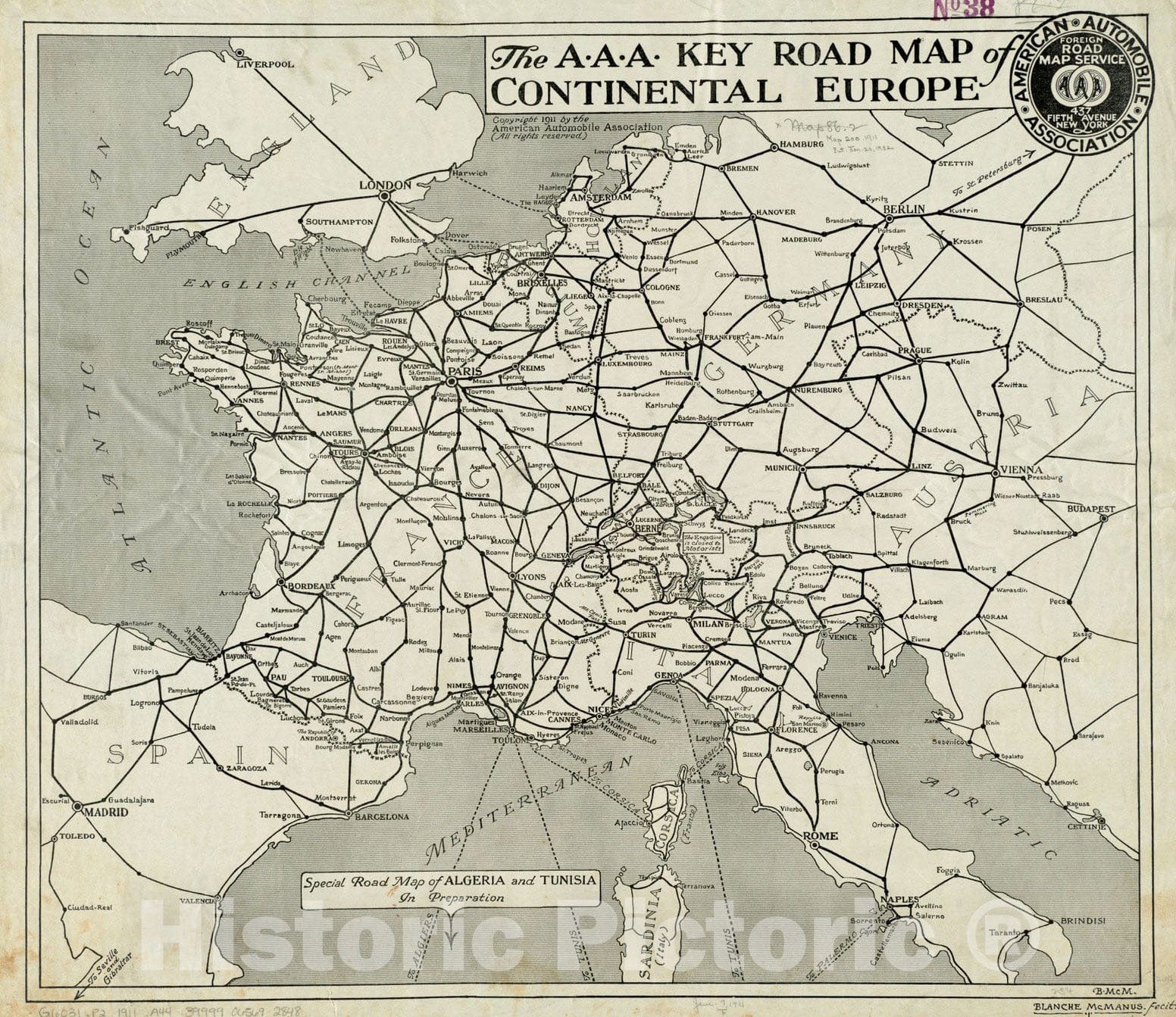 Historical Map, 1911 The A.A.A. key road map of continental Europe, Vintage Wall Art