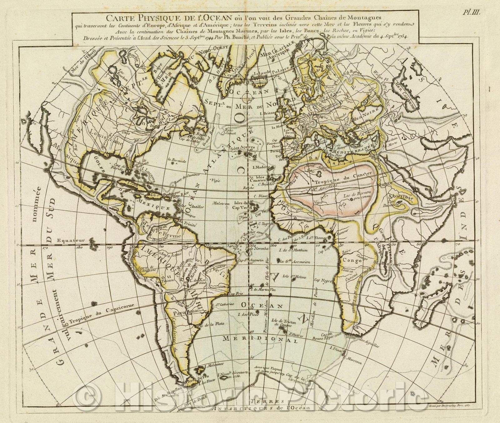 Historic Map : Carte Physique de l'Ocean ou l'on voit des grandes Chaines de Montagnes qui traversent les Continents d'Europe, d'Afrique et d'Amerique, 1757 , Vintage Wall Art