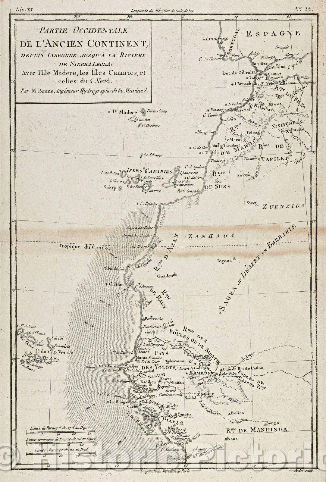 Historic Map : Partie Occidentale De l'Ancien Continent, depuis Lisbonne jusqu'a? la Rivie?re de Sierra Leona : avec l'Isle Made?re, les Isles Canaires, 1780 , Vintage Wall Art