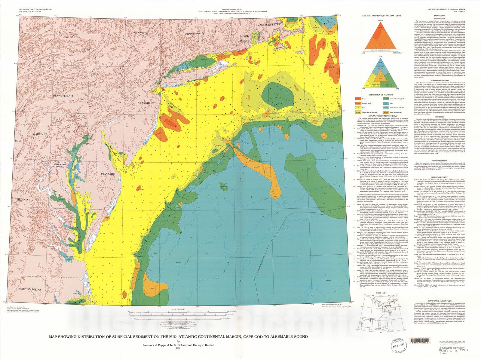 • .Map : Map showing the distribution of surficial sediment on the mid-Atlantic continental margin, Cape Cod to Albemarle Sound, 1994 Cartography Wall Art :