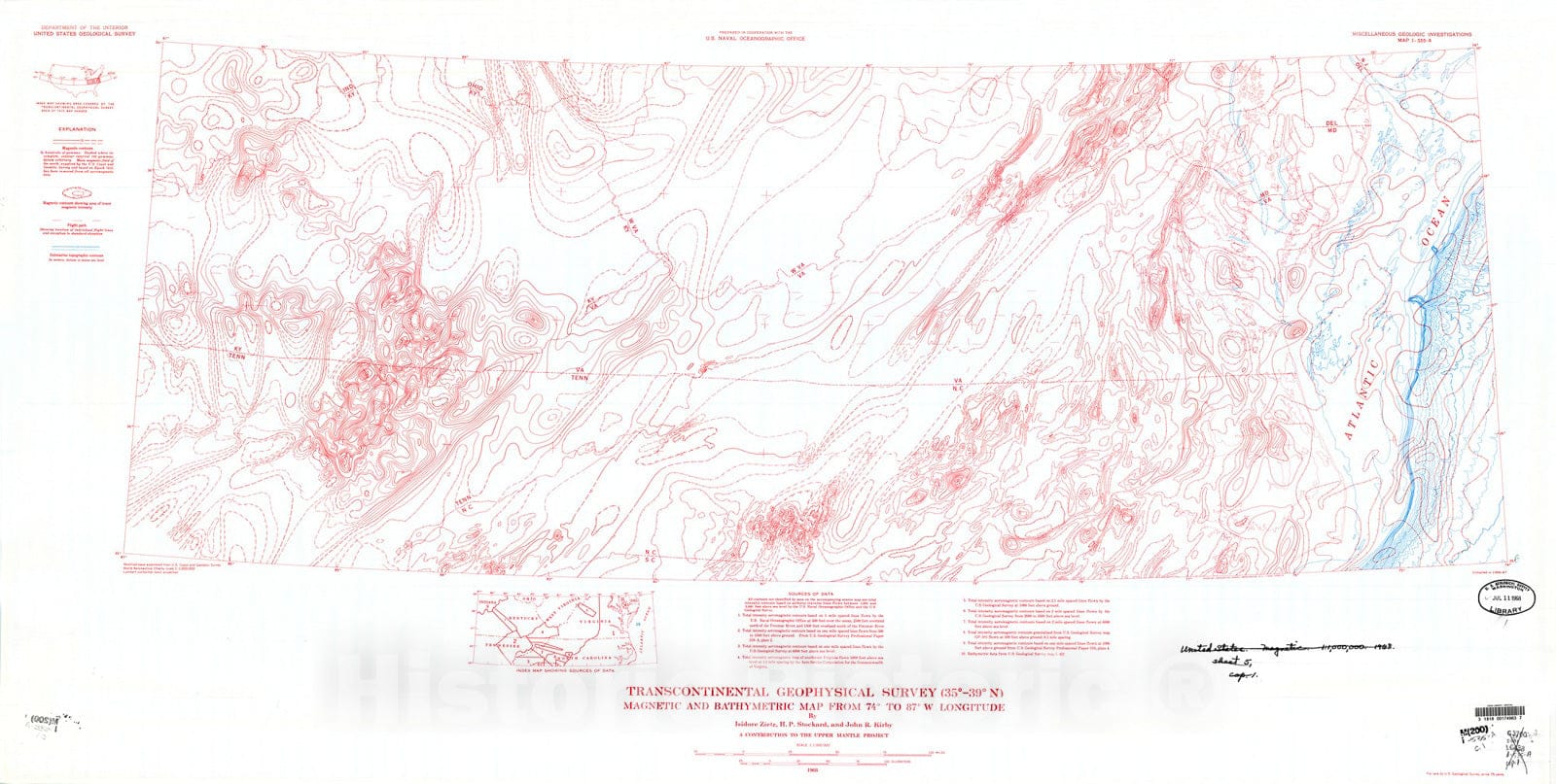 Map : Transcontinental geophysical survey (35 degrees - thirty-nine degrees N): Magnetic and bathymetric map from seventy-four degrees to eighty-seven degrees W longitude, 1968 Cartography Wall Art :