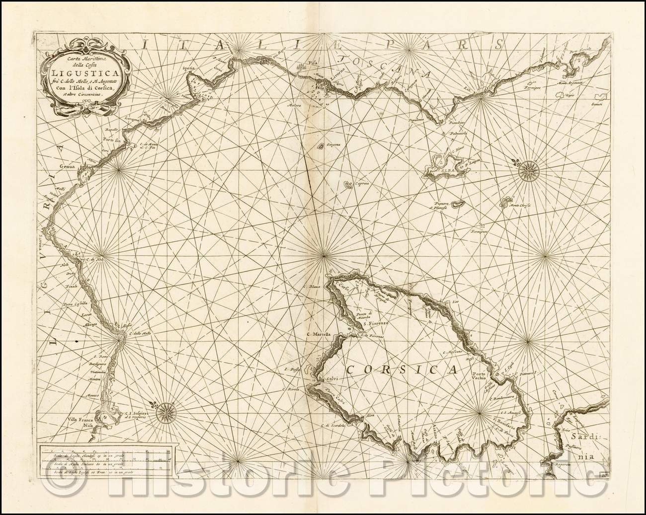 Historic Map - Carta Maritima della Costa Ligustica fra C. delle Melle e M. Argentato con l'Isola di C :: Chart of the coast of Liguria and Tuscany, Corsica, 1695 - Vintage Wall Art