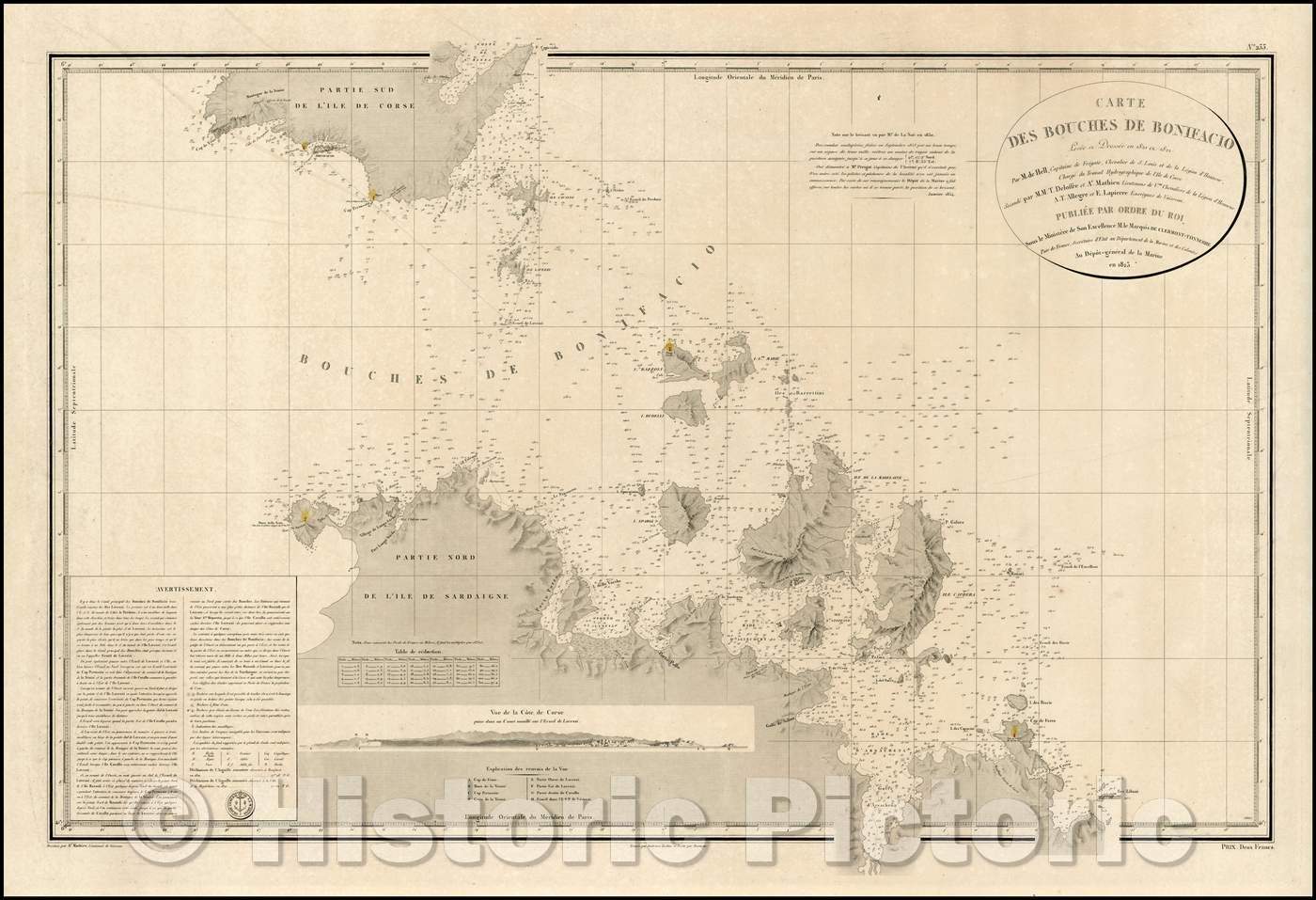 • .Historic Map - Carte Des Bouches De Bonifacio Levee a Dressee en 1821 et 1822 Par M. De Hell/Map of channel between the Islands of Corsica and Sardinia, 1823 - Vintage Wall Art