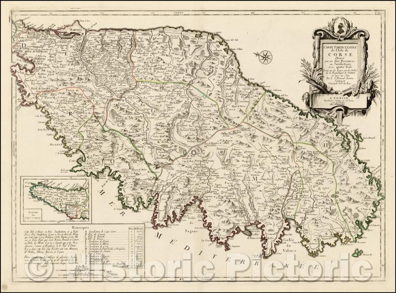 Historic Map - Carte Particuliere de L'Isle de Corse Divisee par ses Dix Provinces ou Juridictions/Format Map of Corsica, oriented with east at the top, 1780 - Vintage Wall Art
