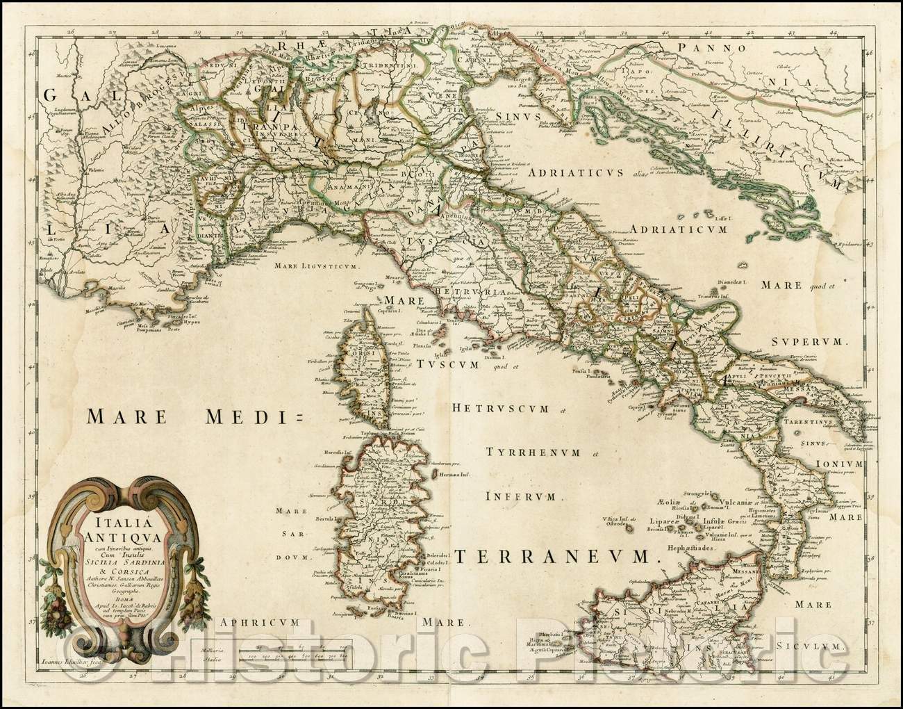 • .Historic Map - Italia Antiqua cum Itineribus antiquis Cum Insulis Sicilia Sardinia & Corsica/Map of Italy, Sicily, Corsica and Sardinia, 1675 - Vintage Wall Art