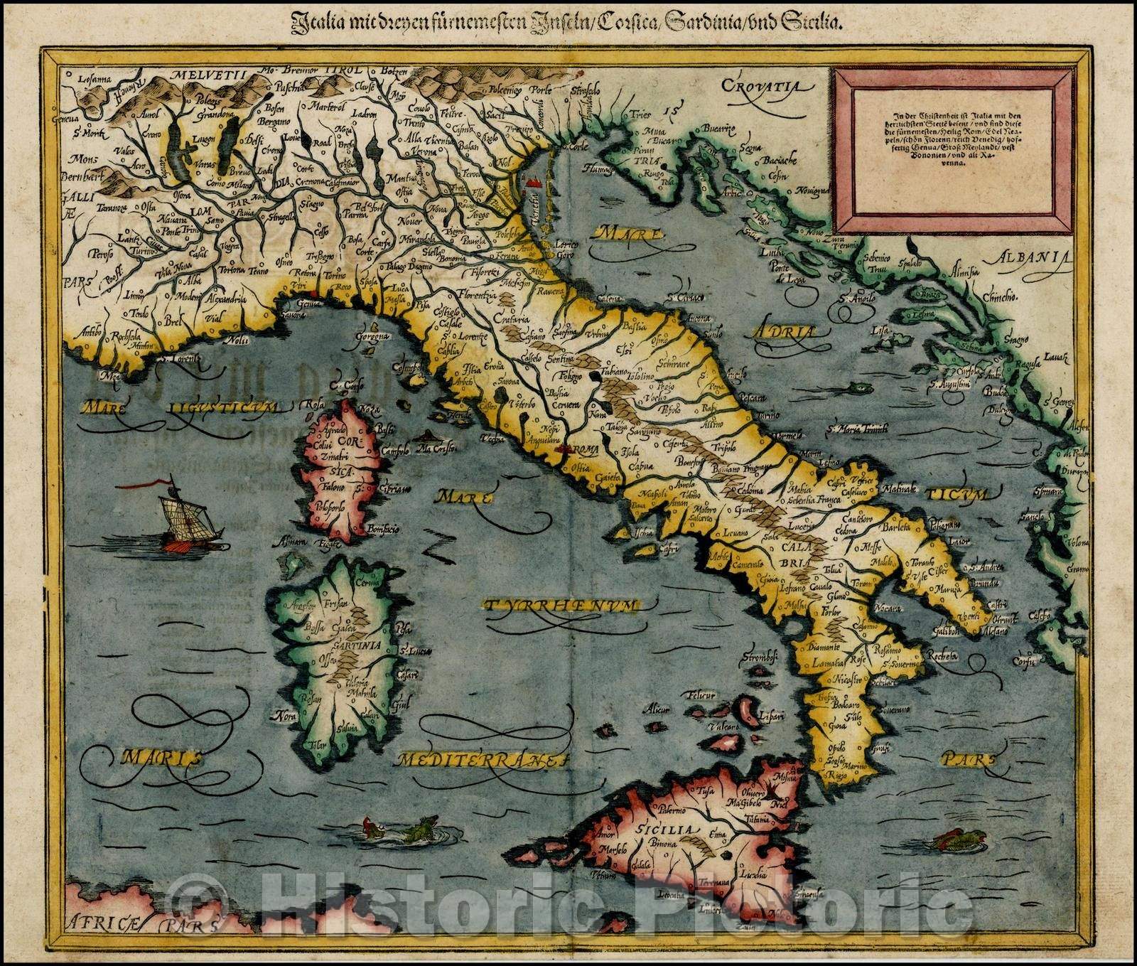 Historic Map - Italia Mit Den Dreyen Furnempften Inseln, Corsica, Sardinia, und Sicilia, 1588, Sebastian M?nster - Vintage Wall Art