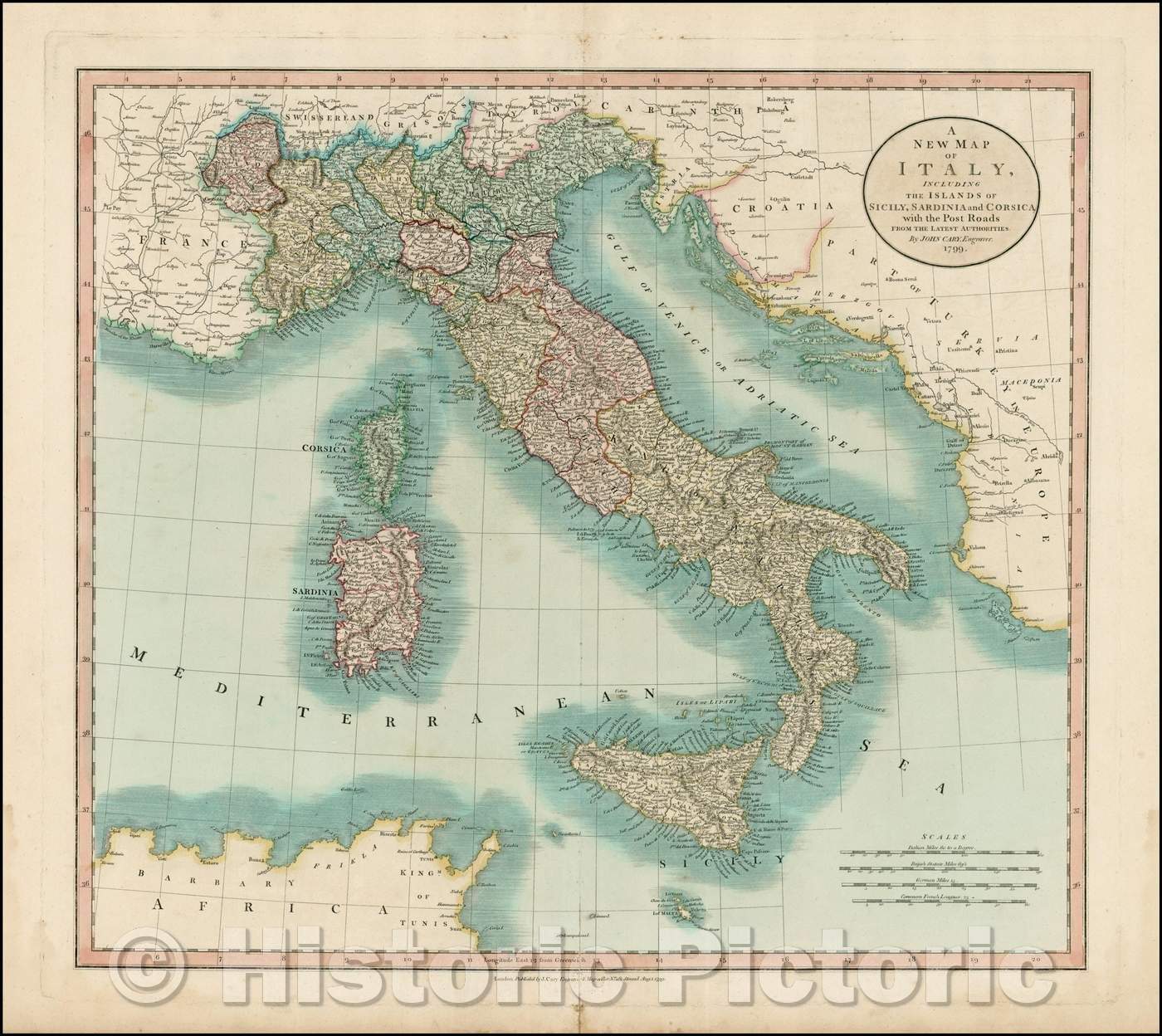 Historic Map - Italy, Including The Islands of Sicily, Sardinia and Corsica, with the Post Roads, 1799, John Cary - Vintage Wall Art