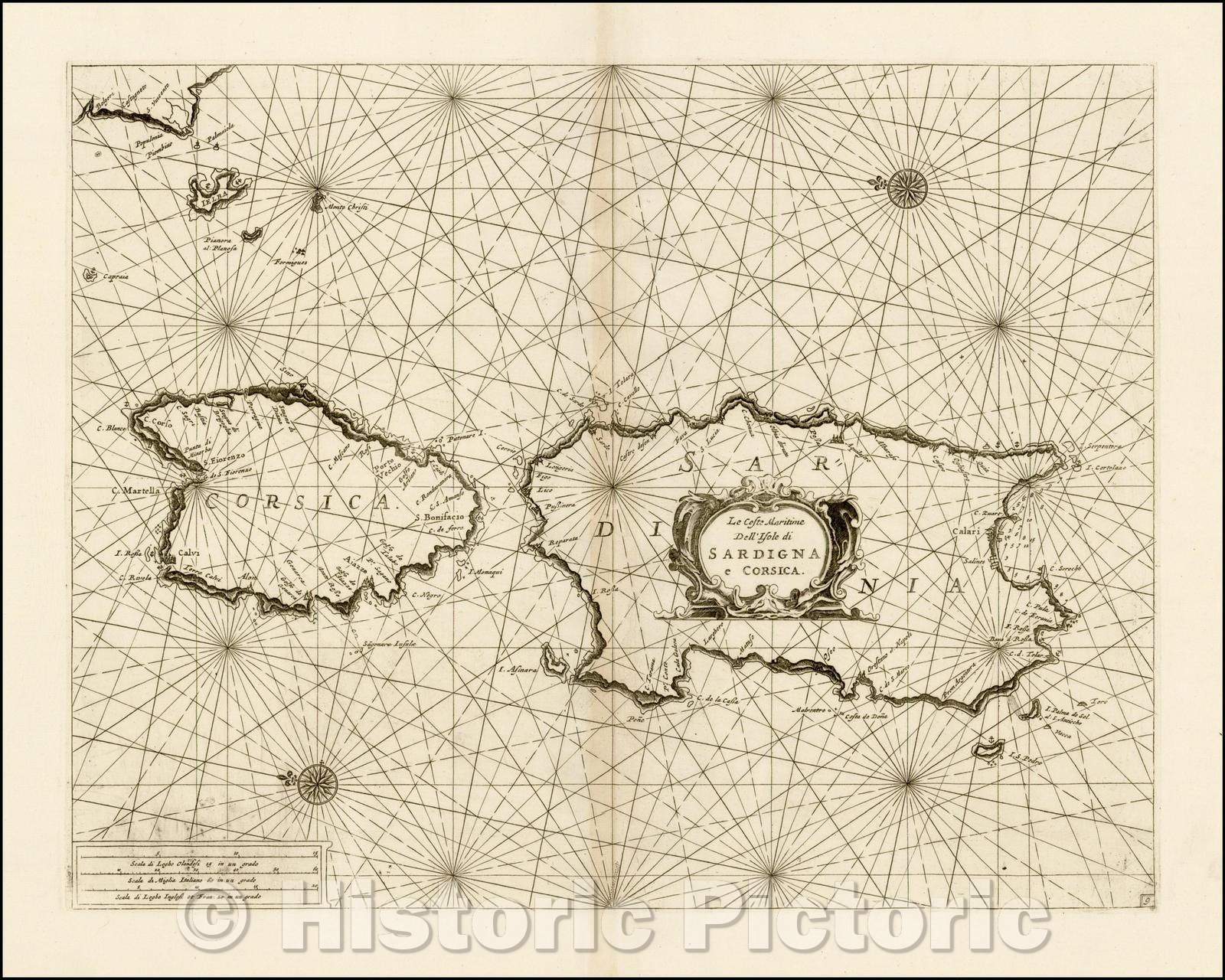• .Historic Map - Le Coste Maritime Dell'Isole di Sardigna e Corsica/Chart of the islands of Corsica, Sardinia and Elba, 1695, Vincenzo Maria Coronelli - Vintage Wall Art