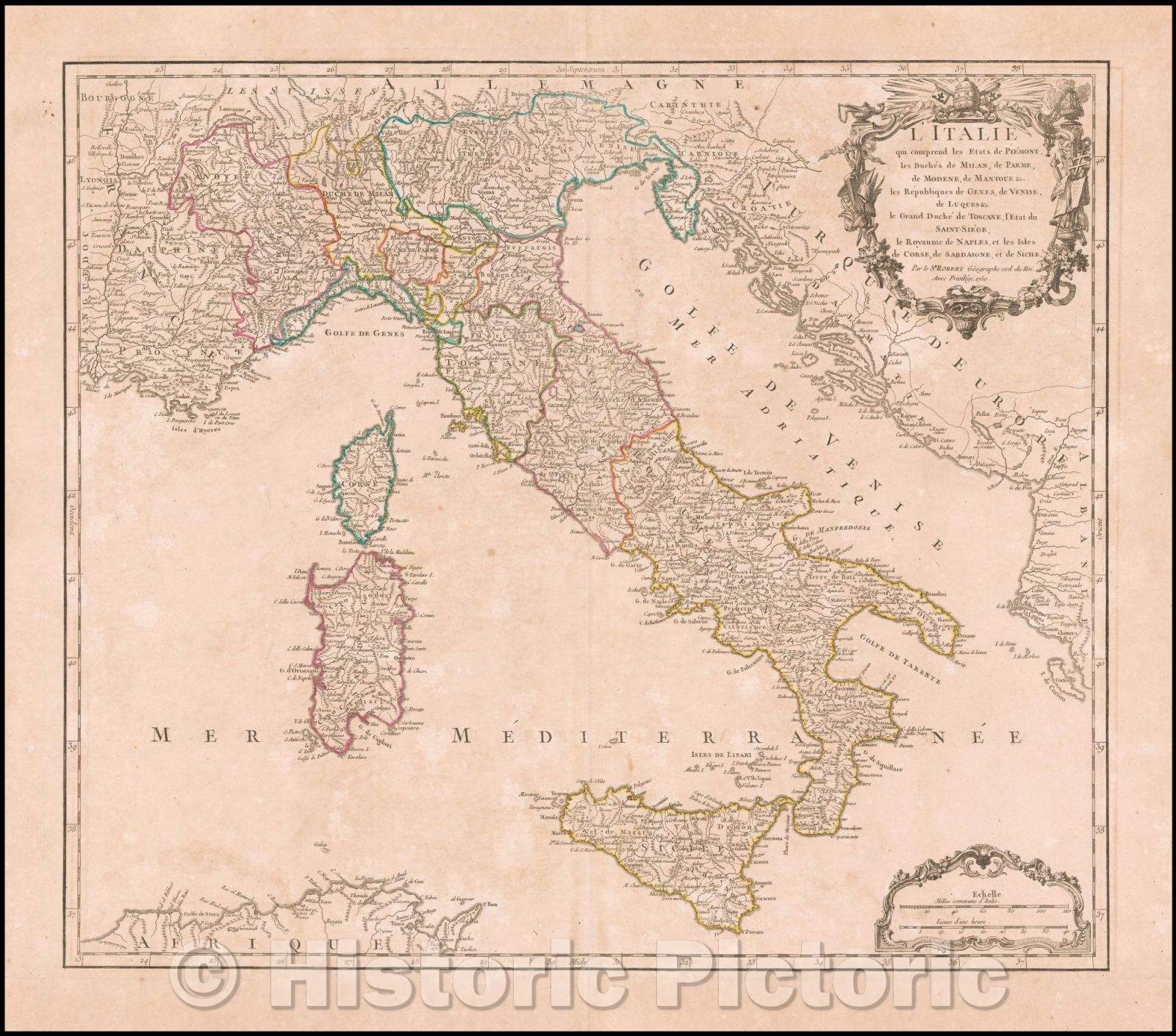 Historic Map - L'Italie qui comprend les Etats de Piemont, les Duches de Milan, de Parme, de Modene/Map of Italy, Sicily, Sardinia & Corsica, 1757 - Vintage Wall Art