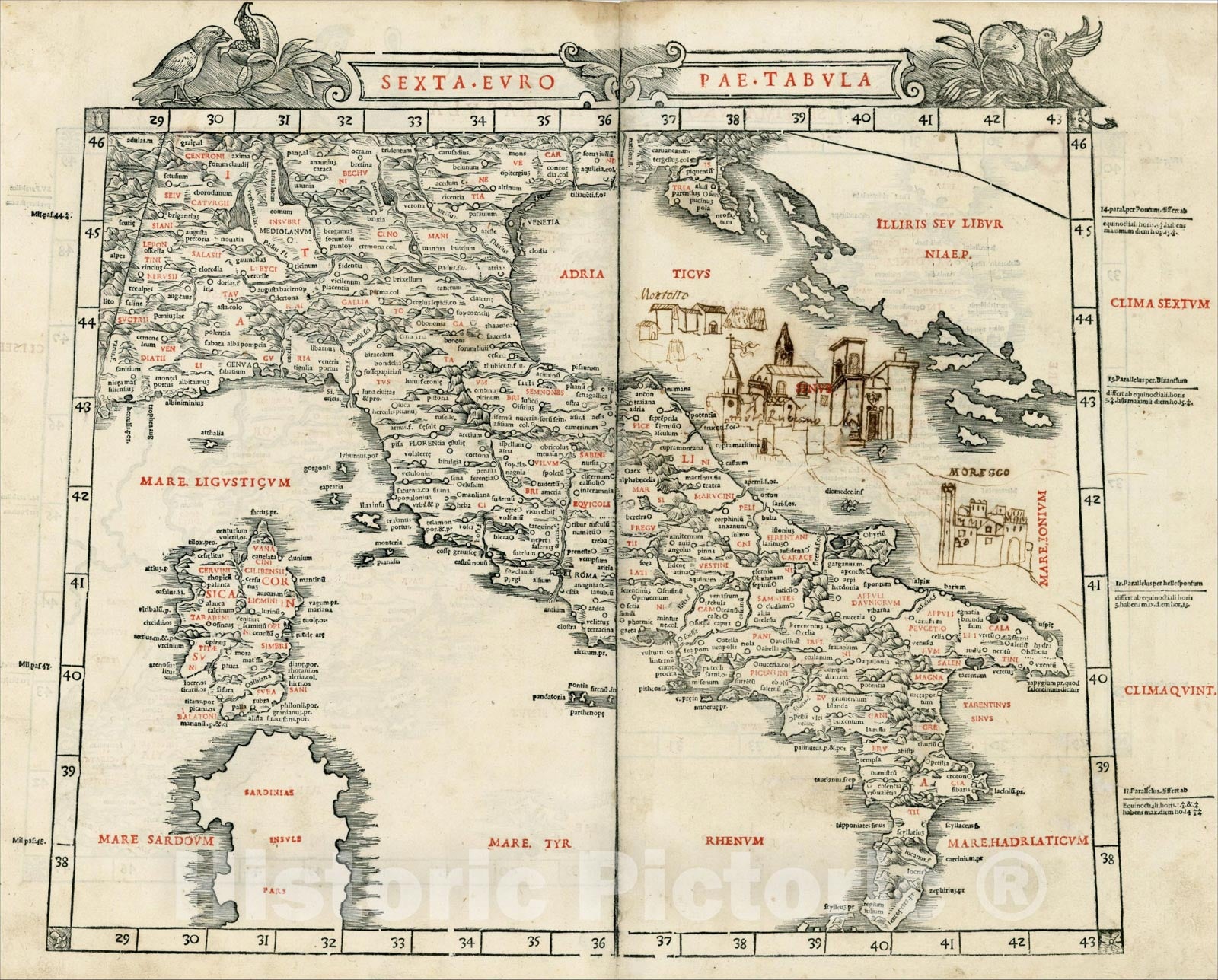 • .Historic Map : Sexta Europae Tabula [Italy, Corsica, Adriatic], 1511, , Vintage Wall Art