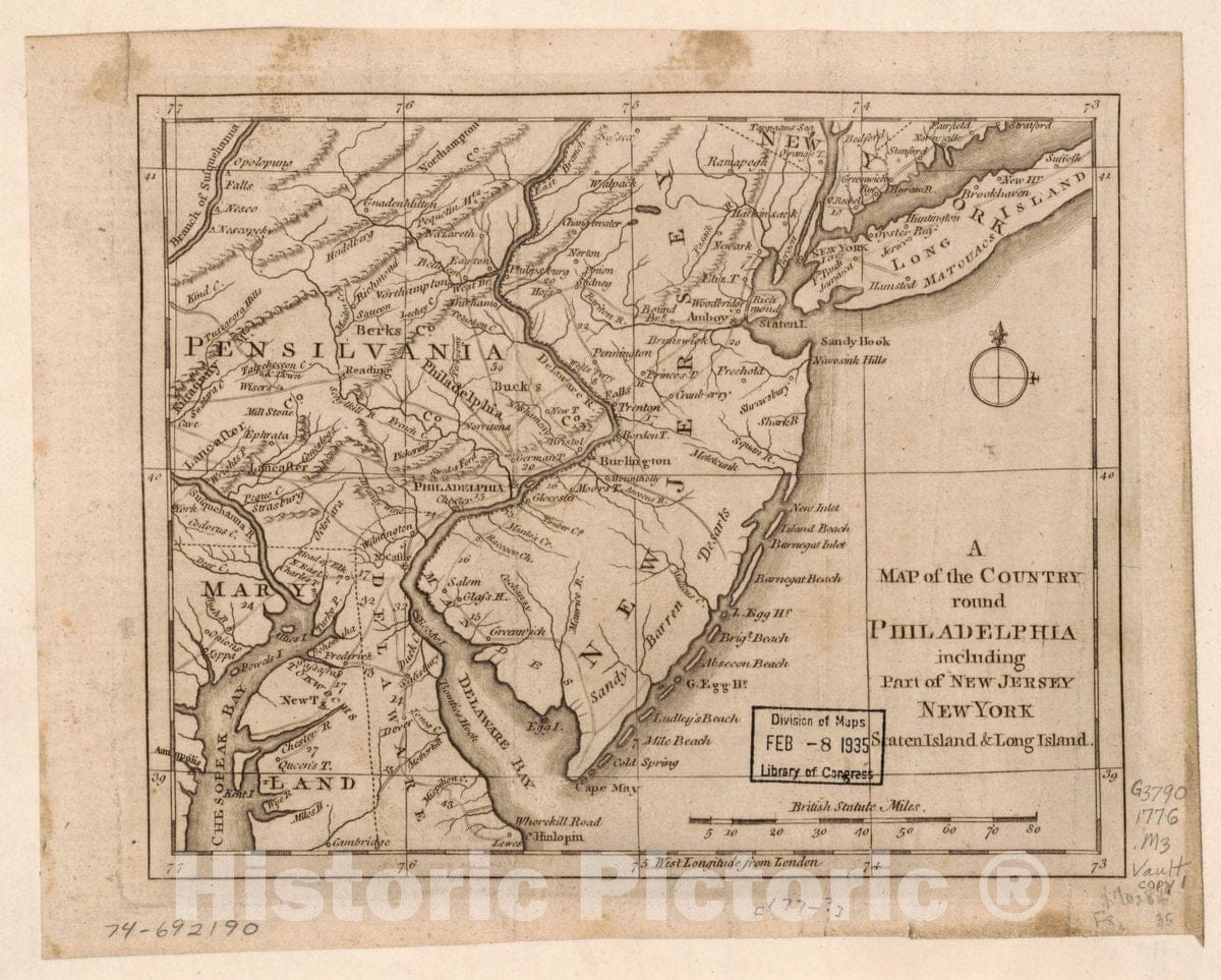• .Historic 1776 Map - A Map Of The Country Round Philadelphia : Including Part Of New - Vintage Wall Art