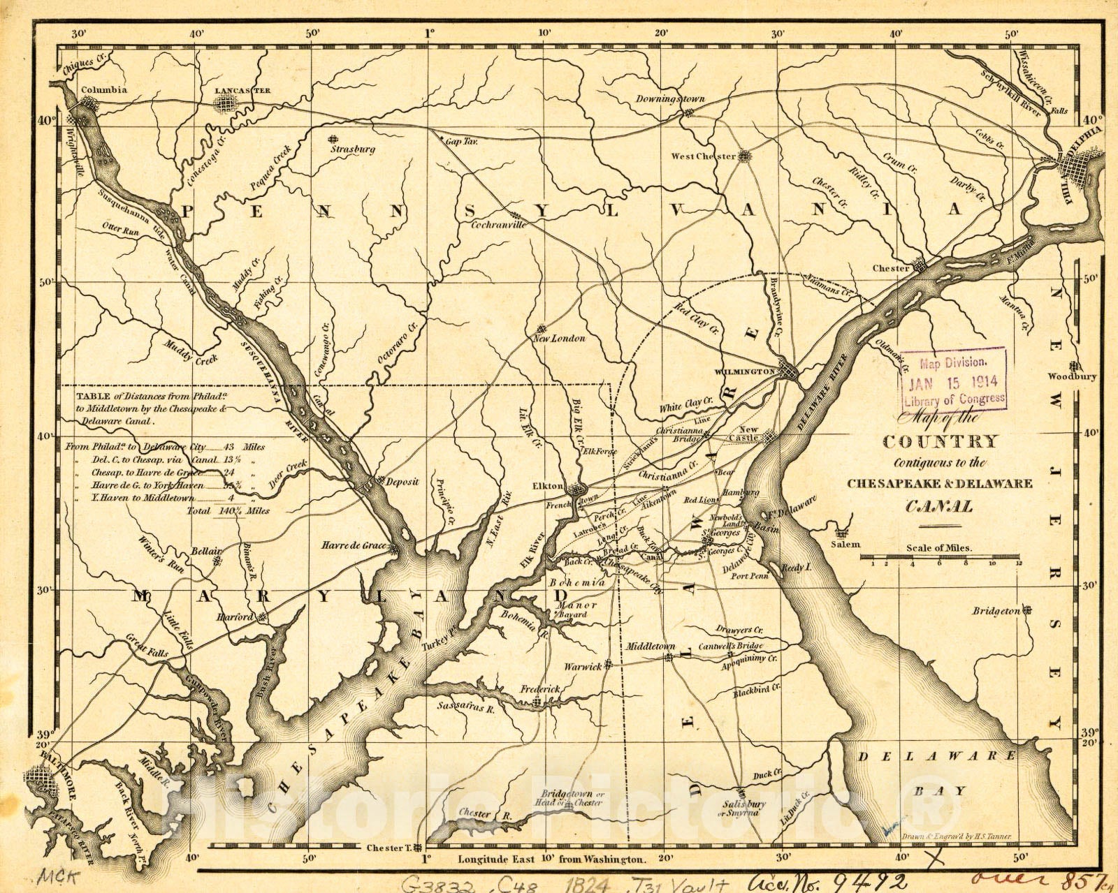 Historic 1824 Map - Map of The Country contiguous to The Chesapeake & Delaware Canal
