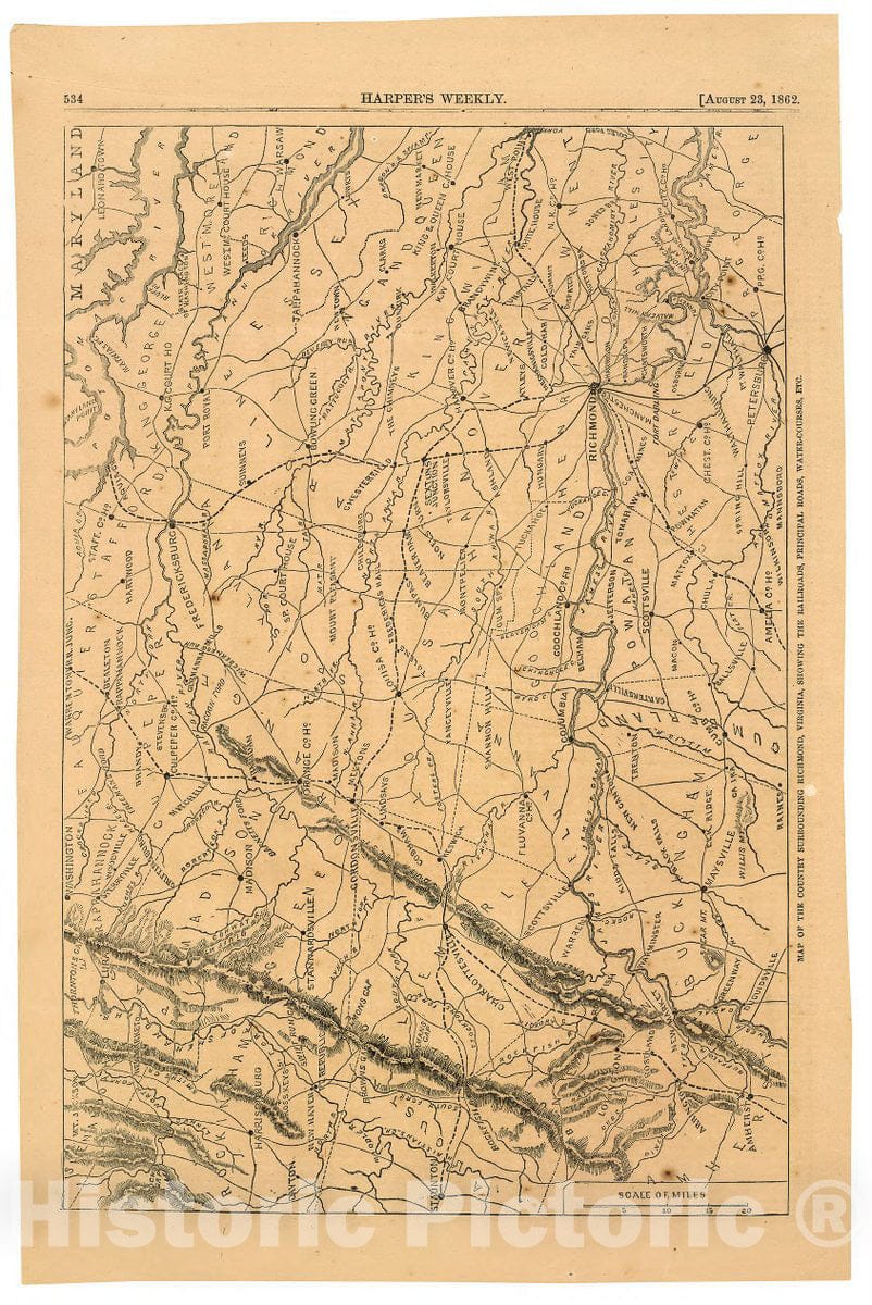 • Historic 1862 Map - Map of The Country Surrounding Richmond, Virginia : Showing The Railroads, Principal Roads, Water-Courses, etc.