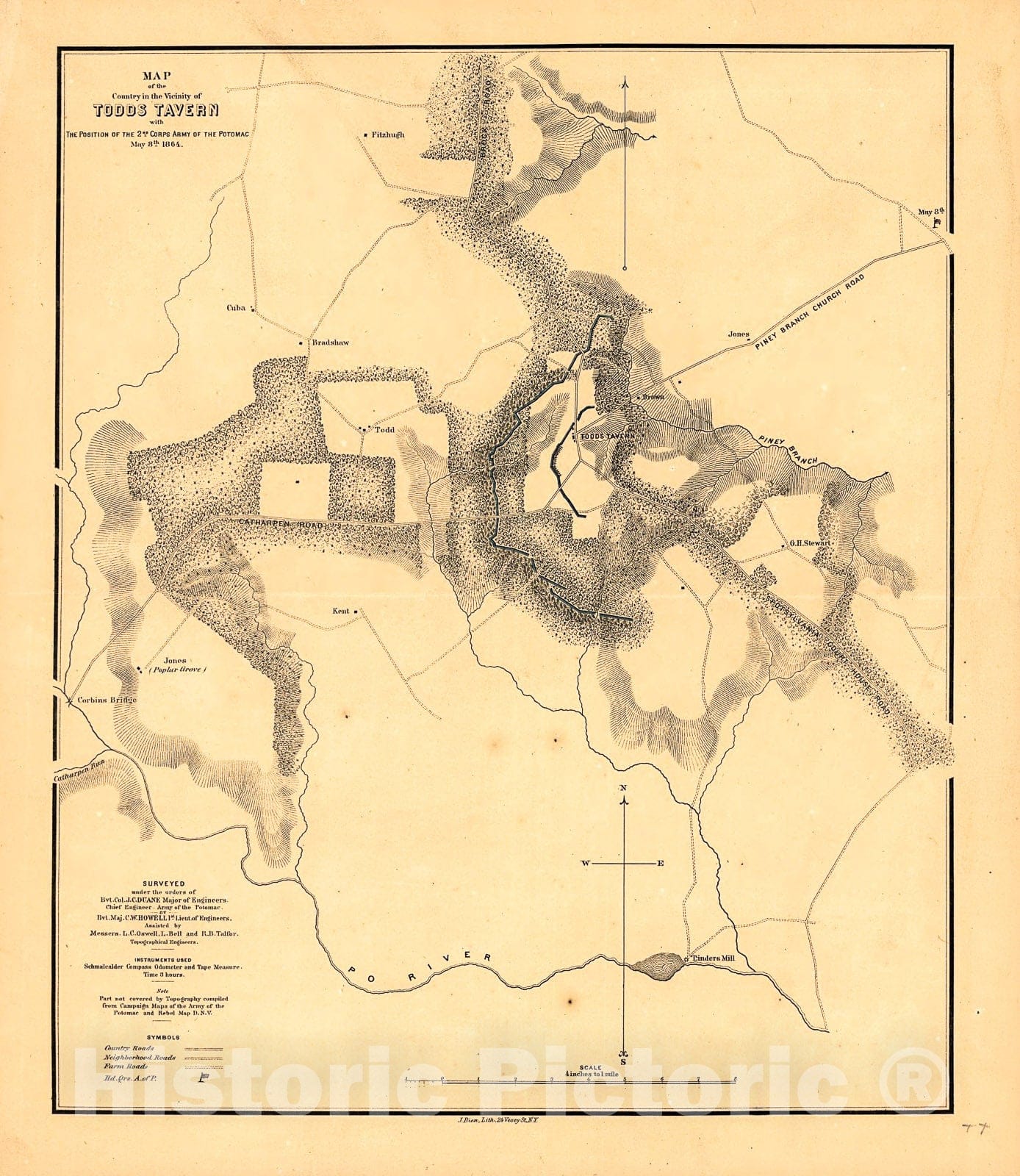 • .Historic 1865 Map - Map of The Country in The Vicinity of Todds Tavern, with The Position of The 2nd Corps Army of The Potomac, May 8th, 1864