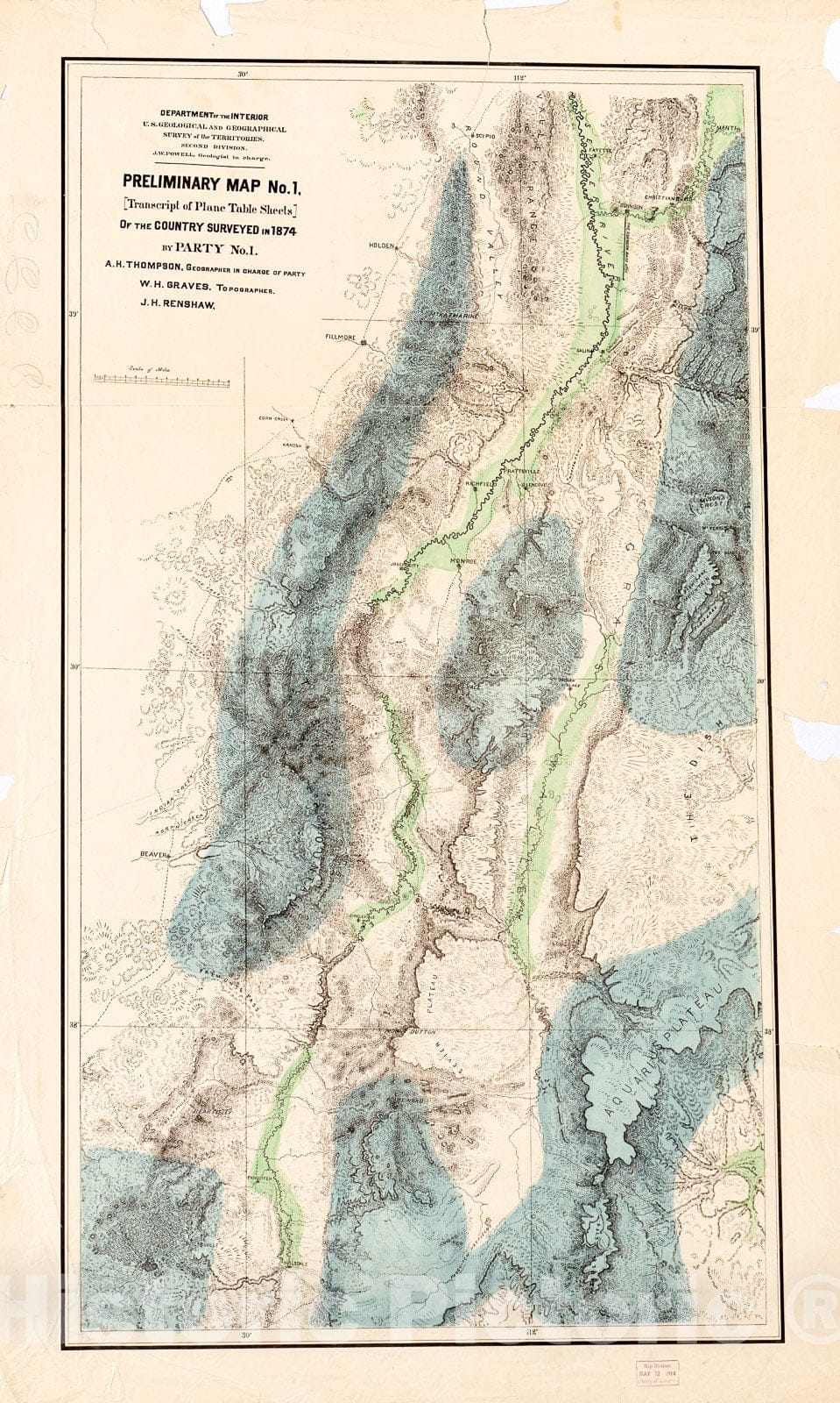 Historic 1874 Map - Preliminary map no. 1, (Transcript of Plane Table Sheets) of The Country surveyed in 1874 by Party No. 1
