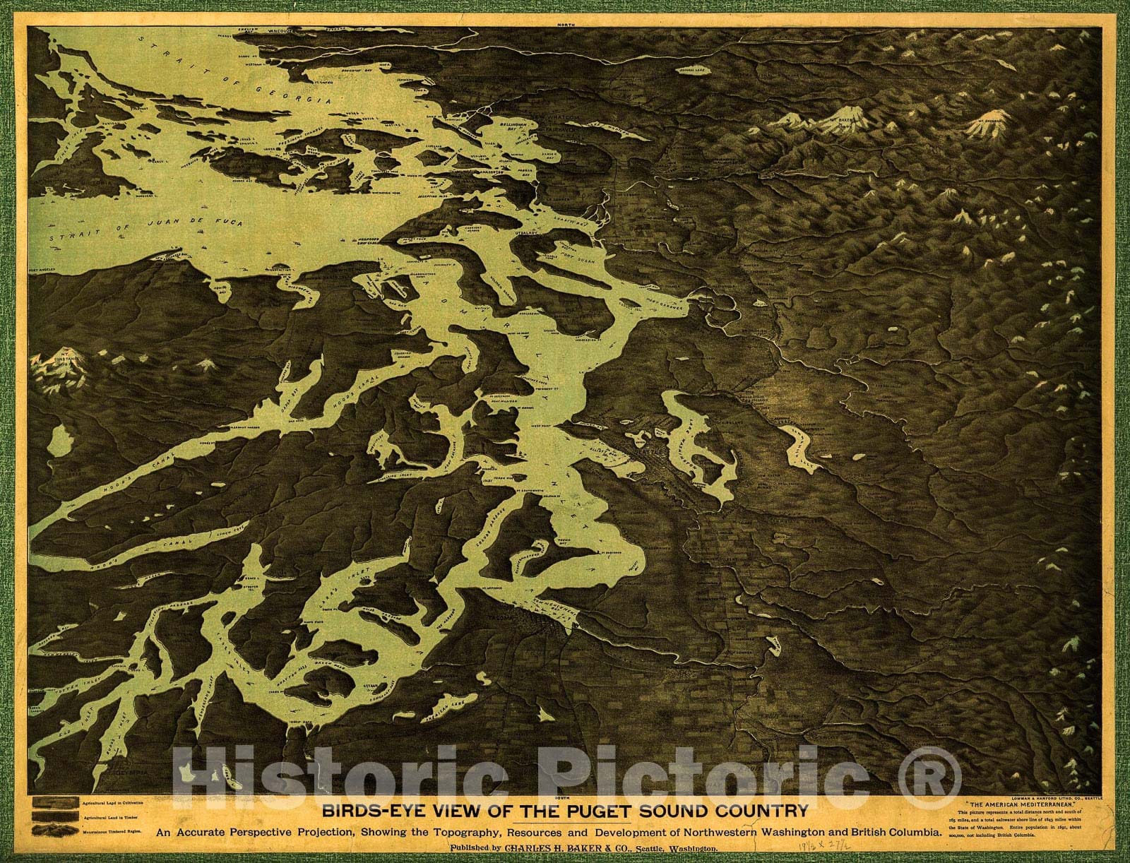 Historic 1891 Map - Birds-Eye View of The Puget Sound Country.