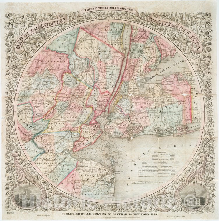Historic Map - 1849 New York (N.Y.), Map Of The Country Thirty Three Miles Around The City Of New York