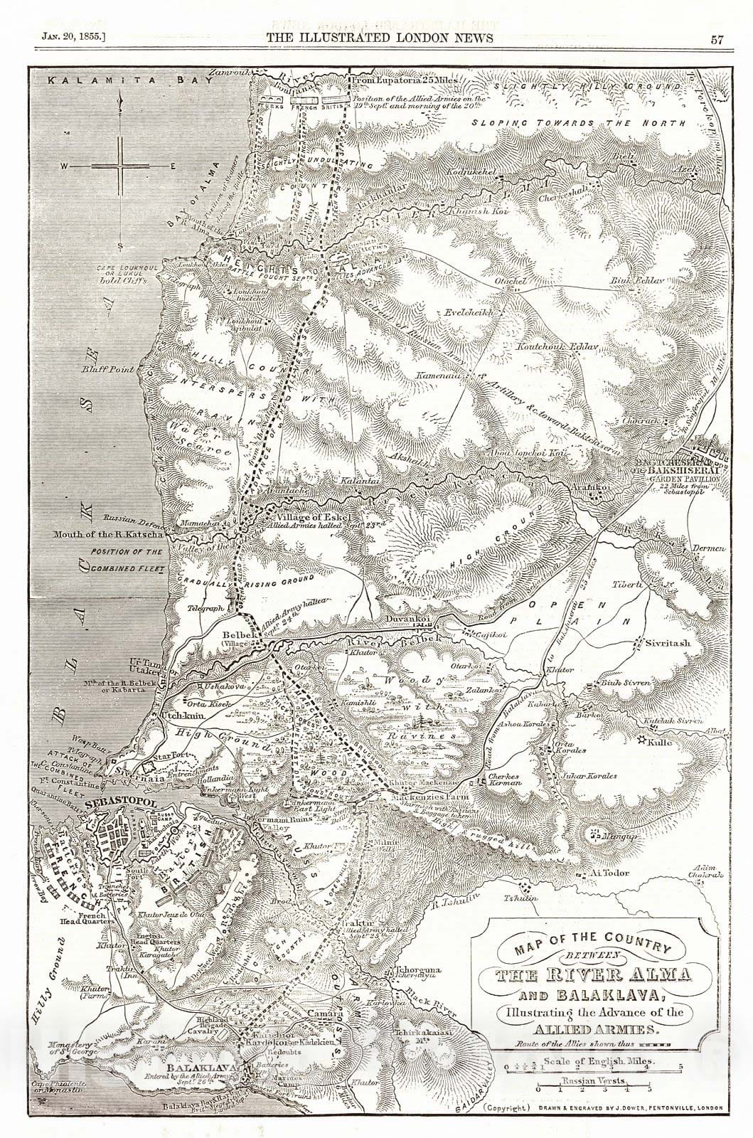 Historic Map : 1855 Map of the Country between the River Alma and Balaklava, Illustrating the Advance of the Allied Armies : Vintage Wall Art