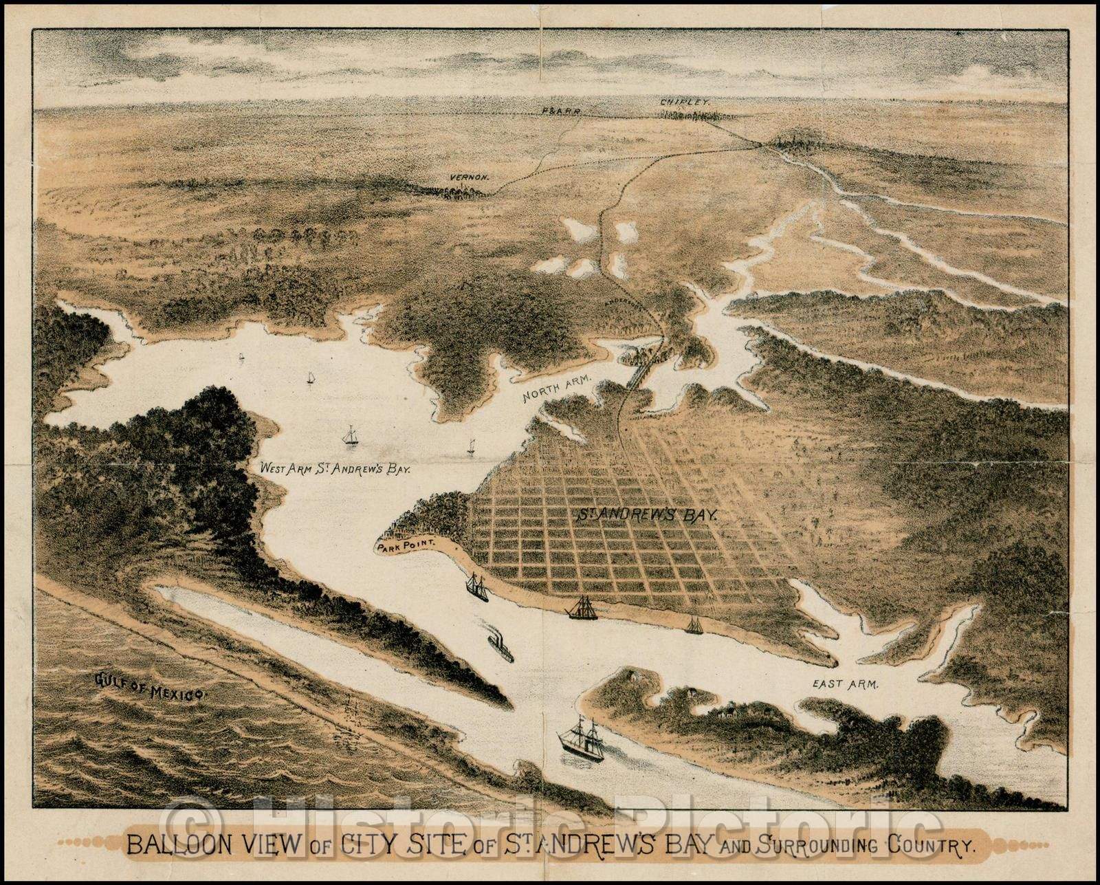 • .Historic Map - Balloon View of City Site of St. Andrew's Bay and Surrounding Country, 1885, Anonymous - Vintage Wall Art