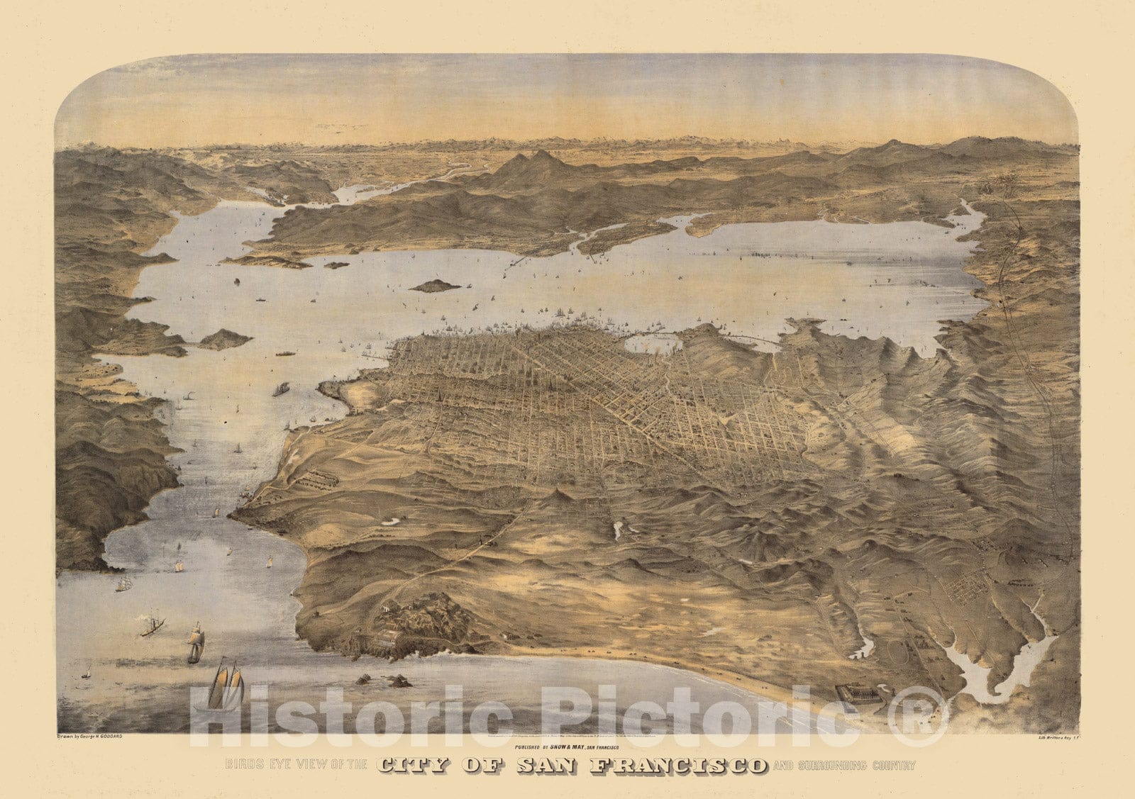 Historic Map - Birds eye view of the city of San Francisco and surrounding country. Drawn by George H. Goddard. Lith. Britton & Rey, S.F, 1868 - Vintage Wall Art