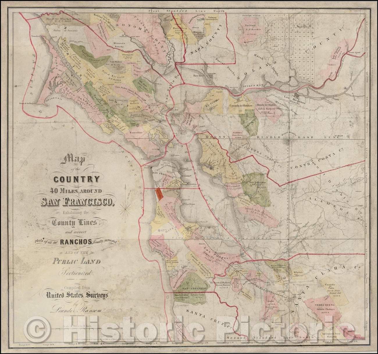Historic Map - Map of the Country 40 Miles Around San Francisco, Exhibiting County Lines, and correct Plats of all the Ranchos finally, 1860, Leander Ransom - Vintage Wall Art