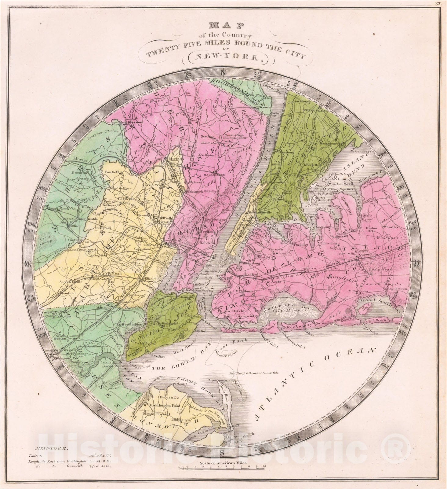 • .Historic Map : Map of the Country Twenty Five Miles Round The City of New-York, 1834, David Hugh Burr, Vintage Wall Art