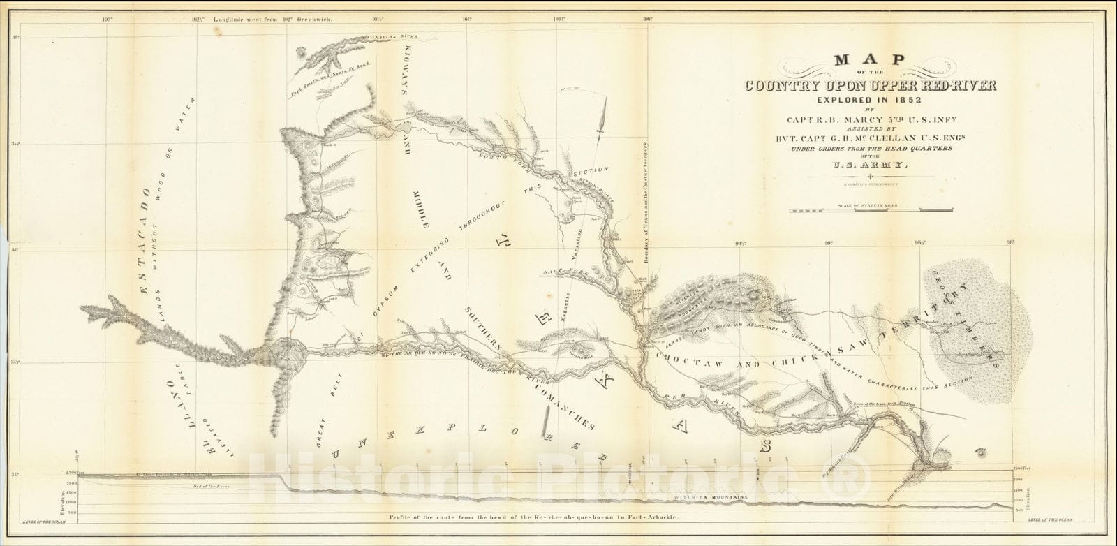 Historic Map : Map of the Country Upon Upper Red River, 1853, R.B. Marcy, Vintage Wall Art